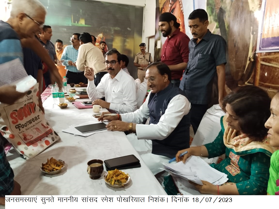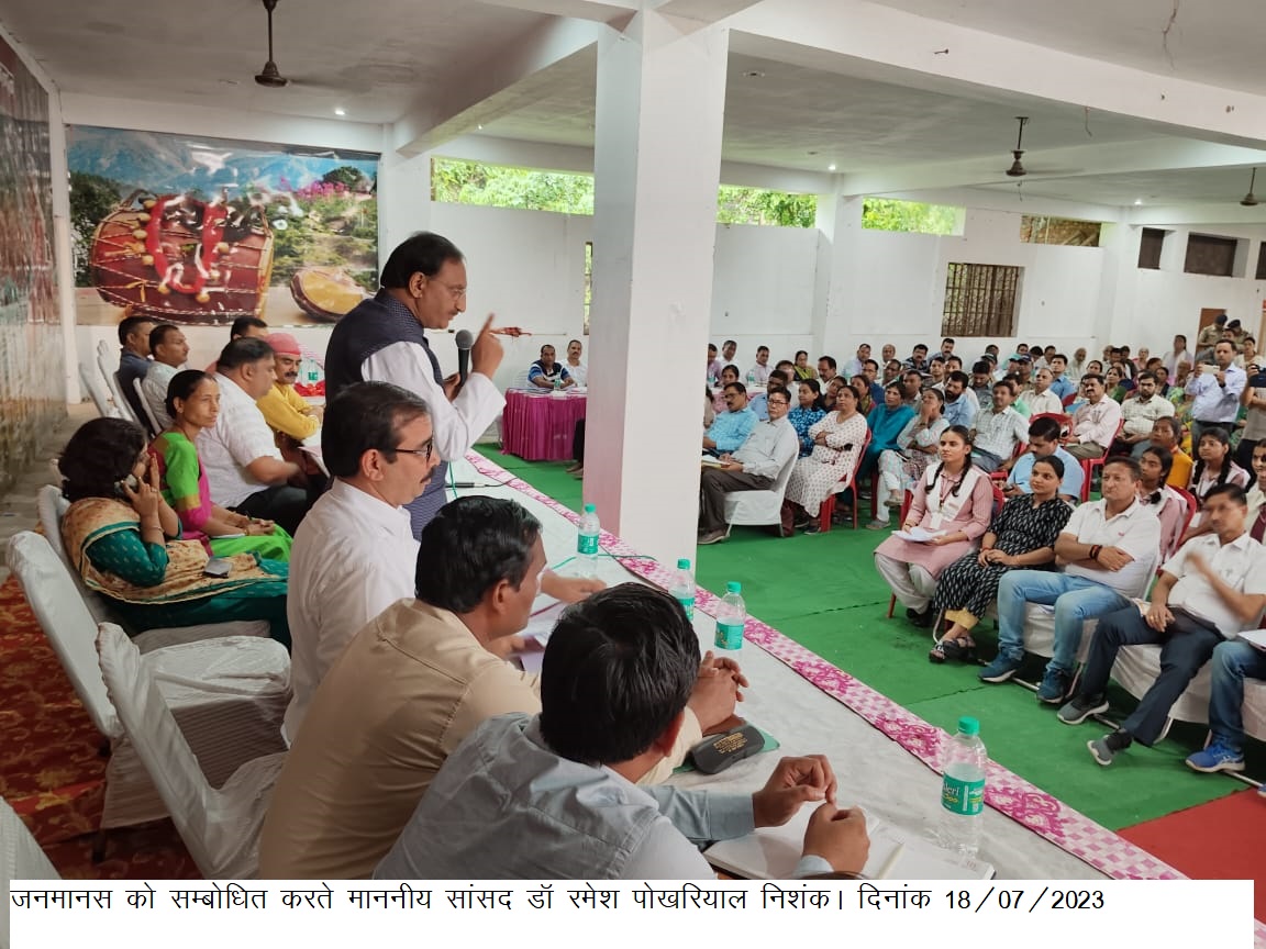 मा० सांसद लोक सभा, हरिद्वार क्षेत्र डॉ0 रमेश पोखरियाल निशंक की अध्यक्षता में सामुदायिक भवन खदरीखडक माफ में बैठक एवं जनता दरबार आयोजित किया गया। श्री निशंक द्वारा मनाननीय सांसद आदर्श ग्राम योजना के अन्तर्गत द्वितीय चरण (वर्ष 2023-24 ) हेतु विकासखण्ड डोईवाला के ग्राम सभा खदरीखडक माफ (हमारो अपणु ) का चयन किया गया है । माननीय सांसद ने बैठक लेते हुए सम्बन्धित विभागों के अधिकारियों को वी०डी०पी० तैयार किए जाने के सम्बंध में आवश्यक दिशा-निर्देश दिए।
