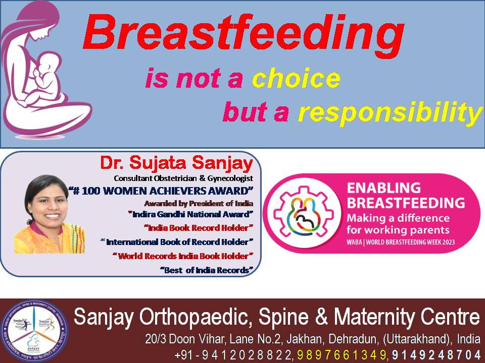 संजय मैटरनिटी सेन्टर, द्वारा स्तनपान की महत्व के बारे में जागरूकता फैलाने एवं शिशुओं को कुपोषण से बचाने के लिए इस कार्यक्रम में डॉ. सुजाता संजय द्वारा विश्व स्तनपान सप्ताह के अंतर्गत गर्भवती महिलाओं व माताएं एवं नर्सिंग छात्राओं के लिए स्तनपान के महत्व के बारे में जागरूक किया गया डॉक्टर सुजाता संजय व उनके अस्पताल द्वारा तीन वेबीनार एक सेमिनार व दो रेडियो कार्यक्रमों का आयोजन किया गया।