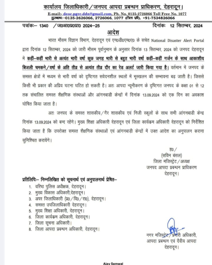भारत मौसम विज्ञान विभाग, देहरादून एवं एन०डी०एम०ए० के सचेत National Disaster Alert Portal द्वारा  दिनांक 13 सितम्बर, 2024 को जनपद देहरादून में कहीं-कहीं भारी से अत्यंत भारी वर्षा कुछ जगह भारी से बहुत भारी वर्षा कहीं-कहीं गर्जन के साथ आकाशीय बिजली चमकने/वर्षा के अति तीव्र से अत्यंत तीव्र दौर का रेड अलर्ट जारी किया गया है। वर्तमान में जनपद के समस्त क्षेत्रों में मध्यम से भारी वर्षा को दृष्टिगत सवेदनशील स्थलों में भूस्खलन की सम्भावना बढ़ जाती है। जिससे किसी भी प्रकार की अप्रिय घटना घटित हो सकती है। अतः आपदा न्यूनीकरण के दृष्टिगत जनपद के कक्षा 01 से 12 तक संचालित समस्त शैक्षणिक संस्थाओं और आंगनबाडी केन्द्रों में दिनांक 13.09.2024 को एक दिन का अवकाश घोषित किया जाता है।