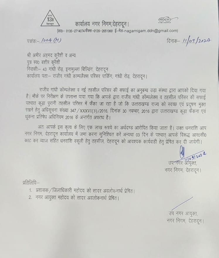 जिलाधिकारी सविन बंसल शहर की सफाई व्यवस्थाओं की स्वयं मॉनिटिरिंग कर रहे हैं। कूड़ा सम्बन्धी शिकायतों पर नगर निगम के अधिकारियों को त्वरित कार्यवाही के निर्देश दिए गए हैं।नगर निगम में व्यवस्था परिवर्तन का असर दिखा। नगर निगम देहरादून द्वारा राजीव गांधी कॉम्प्लेक्स और नई तहसील परिसर की सफाई के लिए अनुबंधित उड़ा संस्था के ठेकेदार अमीर कुरैशी पुत्र बशीर कुरैशी के विरूद्ध चालान की कार्यवाही करते हुए 01 लाख का अर्थदण्ड लगाया गया।