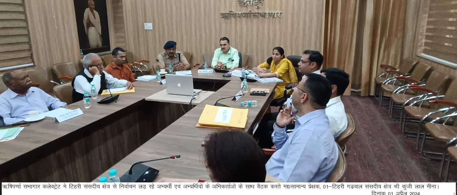 माननीय सामान्य प्रेक्षक, 01-टिहरी गढवाल संसदीय क्षेत्र श्री कुंजी लाल मीना की अध्यक्षता में ऋषिपर्णा सभागार कलेक्टेट मेे टिहरी संसदीय क्षेत्र से निर्वाचन लड़ रहे अभ्यर्थी एवं अभ्यर्थियों के अभिकर्ताओं के साथ बैठक आयोजित की गई। इस दौरान मा0 प्रेक्षक द्वारा निर्वाचन लड़ रहे अभ्यर्थी एवं अभ्यर्थियों के अभिकर्ताओं के सवालों का जवाब देते हुए उनकी शंकाओं का भी समाधान किया। बैठक में लोकसभा सामान्य निर्वाचन-2024 हेतु रिटर्निंग अधिकारी/जिला निर्वाचन अधिकारी श्रीमती सोनिका ने निर्वाचन सम्बन्धी विभिन्न व्यवस्था एवं तैयारियों की जानकारी दी गई। नियुक्त नोडल अधिकारियों द्वारा मा0 प्रेक्षक की उपस्थिति में निर्वाचन लड़ रहे अभ्यर्थी एवं अभ्यर्थियों के अभिकर्ताओं को निर्वाचन के दौरान की जाने वाले गतिविधि एवं कार्यवाही के सम्बन्ध में विस्तार से जानकारी दी गई।