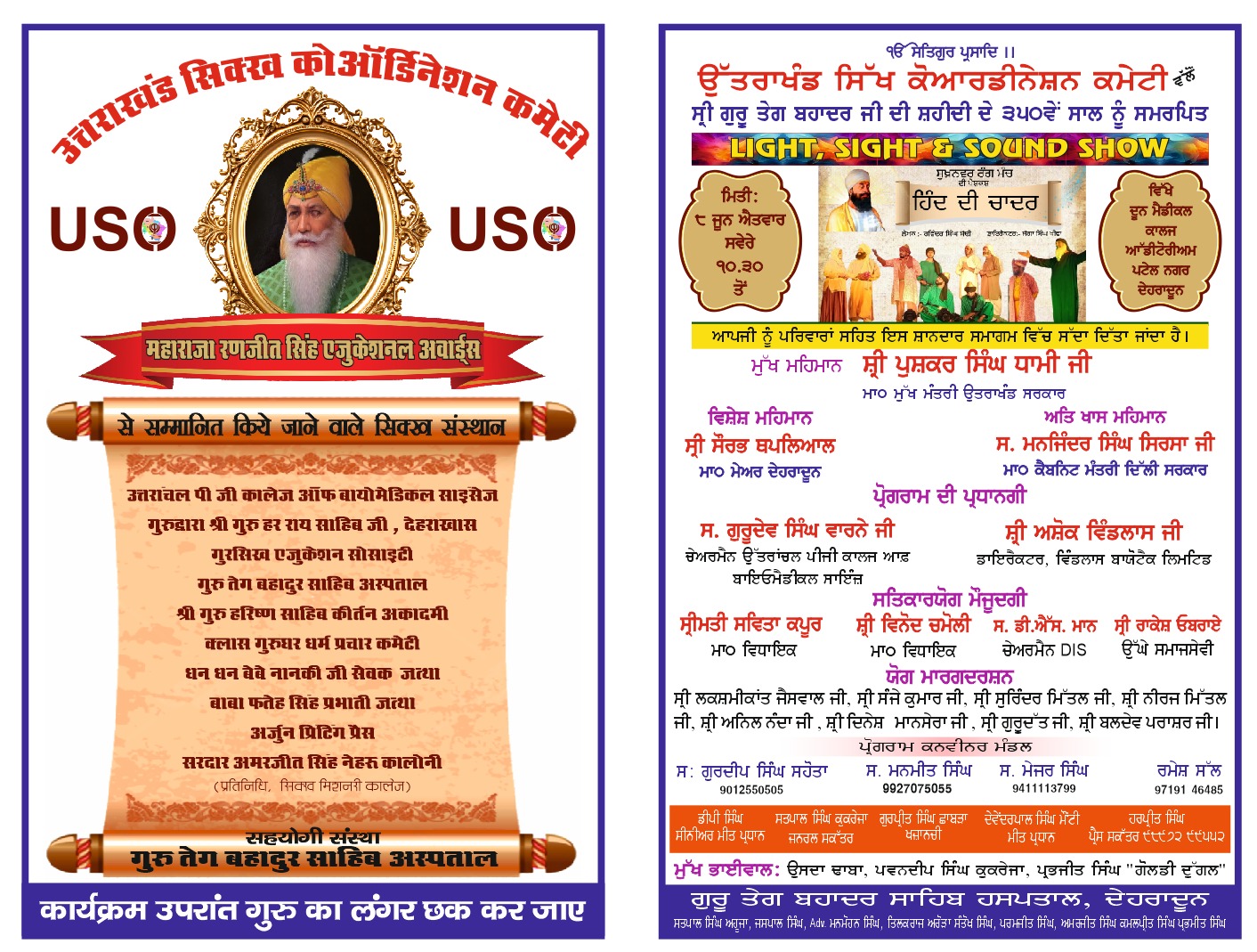 उत्तराखंड सिख कोरडीनेशन कमेटी के गुरदीप सिंह सहोता ने जानकारी देते हुए बताया कि देहरादून में आगामी 8जून 2025, कों दून मेडिकल ऑड़ोटूरियम में हिन्द कि चादर नवम पतशाह श्री गुरु तेग बहादुर सहिब के 350 वें शहीदी गुरपूर्व कों समर्पित कार्यक्रम लाइट, साईट, साउंड के माध्यम से दिखाया जाएगा।