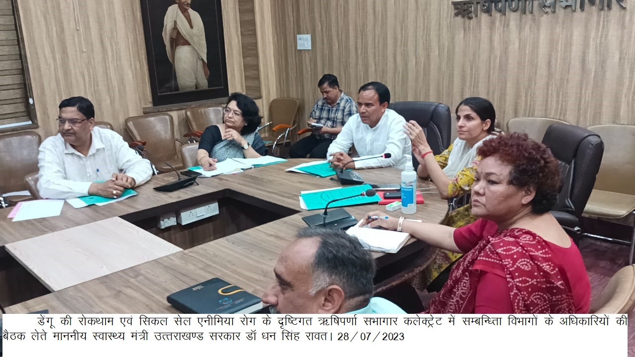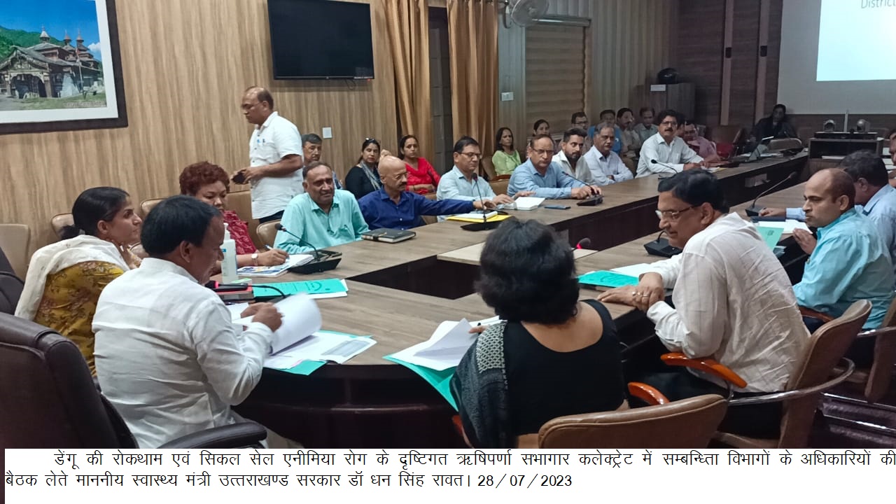 मा0 स्वास्थ्य मंत्री उत्तराखण्ड सरकार श्री धन सिंह रावत ने ऋषिपर्णा सभागार कलेक्ट्रेट में डेंगू संबंधी रेखीय विभाग के अधिकारियों के साथ एवं सिकल सैल एनीमिया रोक के दृष्टिगत बैठक लेते हुए संबंधित विभागीय अधिकारियों को आवश्यक दिशा-निर्देश दिए। मा0 मंत्री ने जनपद में डेंगू की स्थिति एवं डेंगू से बचाव हेतु किए जा रहे निरोधात्मक उपाय की जानकारी प्राप्त की। पर्वतीय क्षेत्र की गर्भवती महिलाओं को सरकार की पहल से प्रसव की संभावित तिथि से एक सप्ताह पूर्व चिकित्सालयों के निकट समुचित सुविधा मुहैया कराते हुए ठहराया जाएगा। डेंगी रोकथाम एवं नियंत्रण पर सम्बन्धित विभाग आपसी समन्वय से युद्धस्तर पर कार्य करेंगे तथा स्कूलों में बच्चों को प्रयोगात्मक शिक्षा के माध्यम से डेंगू के बचाव एवं लार्वा नष्ट करने हेतु जागरूक किया जाएगा। साथ ही प्रत्येक स्तर पर डेंगू की रोकथाम हेतु जागरूकता किया जाएगा।