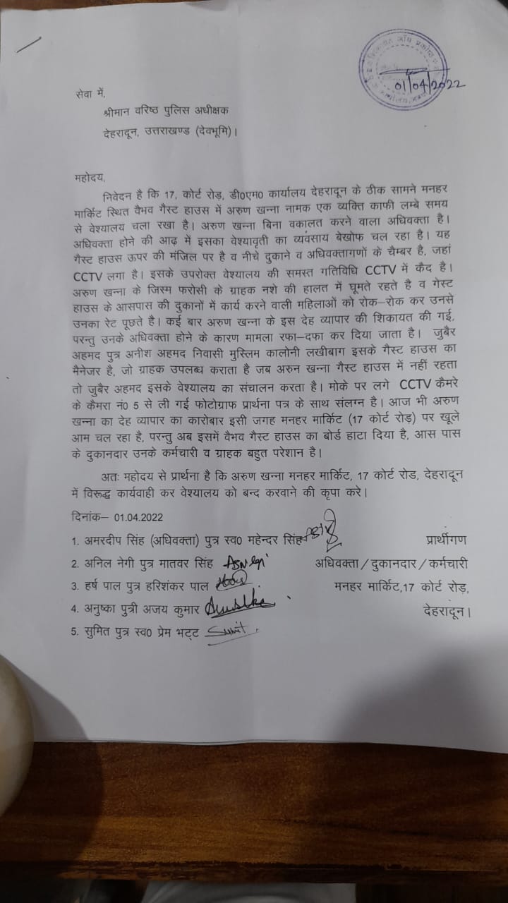 कई बार शिकायत करने के बाद भी अपने अधिवक्ता होने के कारण मामले को रफा-दफा करा देता है ।अधिवक्ता ने वरिष्ठ पुलिस अधीक्षक को दिए गय पत्र में यह बताया कि जुबेर अहमद पुत्र अनीस अहमद निवासी देहरादून इसके अनैतिक व्यापार का संचालन करता है ।
