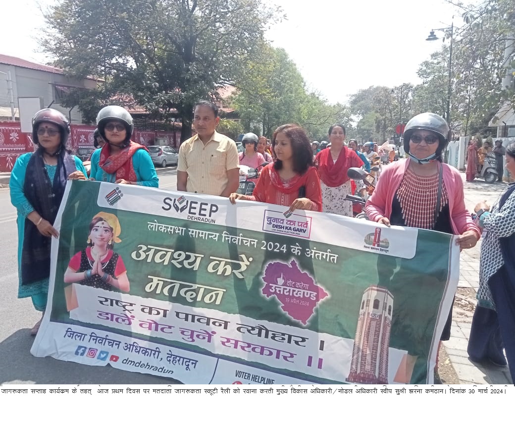 मुख्य विकास अधिकारी /नोडल अधिकारी स्वीप सुश्री झरना कमठान ने 30 मार्च 2024 से 06 अप्रैल 2024 तक बूथ जागरूकता सप्ताह कार्यक्रम के तहत् आज प्रथम दिवस पर महिला मतदाताओं को जागरूक करने हेतु जनपद में विभिन्न स्थानों पर रंगोली एवं स्कूटी रेली का आयोजन किया गया। देहरादून शहर में महिला सशक्तिकरण एवं बाल विकास विभाग की स्कूटी रैली को मुख्य विकास अधिकारी ने फ्लैग ऑफ किया गया। उक्त रेली में लगभग 125 स्कूटी पर 180 महिलाओं द्वारा प्रतिभाग किया गया। उक्त रैली में स्कूटी मतदाता जागरूकता स्टीकर और महिलाओं द्वारा मतदान संबंधी नारों के साथ सर्वे चौक से प्रारंभ होकर बहल चौक से घंटाघर तदोपरांत ई सी रोड होते हुए आराघर पर समापन की गई। रैली मे आंगनबाड़ी कार्यकत्रियों द्वारा राह में चलते लोगों, स्ट्रट वेण्डर, फल विक्रताओं आदि को मतदाता जागरूकता पैम्फलेट भी वितरित किए गए।