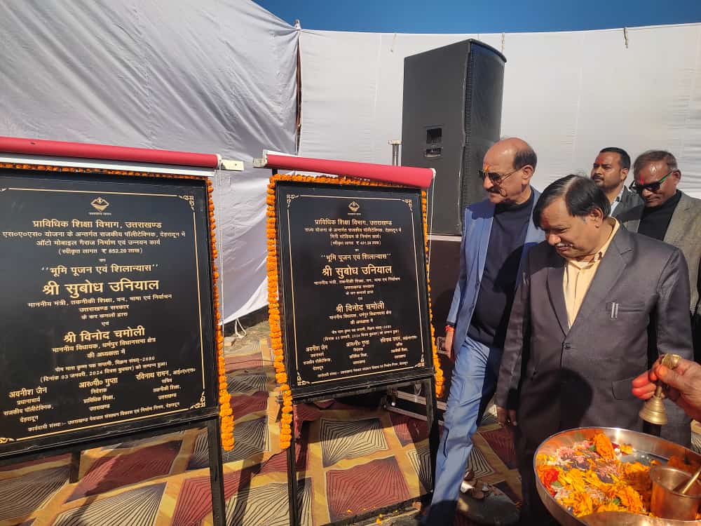 श्री सुबोध उनियाल माननीय मंत्री तकनीकी शिक्षा, वन, भाषा एंव निर्वाचन द्वारा उपस्थित निदेशक प्राविधिक शिक्षा श्री आर०पी० गुप्ता, अपर निदेशक श्री देश राज, तकनीकी शिक्षा विभाग, के विभिन्न अधिकारीगण, पॉलीटेक्निक के प्रधानाचार्य, उत्तराखण्ड पेयजल निगम देहरादून इकाई के परियोजना प्रबन्धक श्री अरविन्द तिवारी, कार्यक्रम में उपस्थित सभी शिक्षणगण-कर्मचारीगण, मीडिया कर्मी एव छात्र-छात्राओं का स्वागत करते हुए। सर्वप्रथम उन्होंने नववर्ष 2024 की शुभकामानाऐं दी। तथा छात्रों से अध्यापकों से अच्छी शिक्षा प्राप्त कर आत्मनिर्भर भारत की ओर अग्रसर होने का आहवाहन किया गया। उनके द्वारा ऑटोमोबाईल सेक्टर में सेन्टर ऑफ एक्सीलेन्स, मिनी स्टेडियम के निर्माण कार्य के प्रारम्भ होने पर तथा नवीनीकरण वर्कशॉप एंव लैंग्वेज लैब के लोकापर्ण के अवसर पर बधाई एंव शुभकामानाऐं दी। उनके द्वारा अवगत कराया गया कि तकनीकी शिक्षा ऐसा क्षेत्र है जिसमें नई एंव आधुनिक तकनीकियों विकसित होती है, जिससे देश आगे बढता है जिसमें छात्र-छात्राऐं वाहक का काम करते हैं। उनके द्वारा अवगत कराया गया कि ऑटो सेक्टर में आपार संभावनाएं बनी है जिससे रोजगार के लगातार अवसर उपलब्ध होंगे। उनके द्वारा यह भी आहवाहन किया गया कि छात्र रोजगार लेने वाले बने रोजगार देने वाले बनें। इन्हीं संभवनाओं को दृष्टिगत रखतेहुए, राजकीय पॉलीटेक्निक देहरादून में एस०ए०एस० योजना के अन्तर्गत रू0 852.20 लाख की लागत से “ऑटो मोबाईल गैराज निर्माण एवं उन्नयन कार्य” जिसके अंतर्गत ऑटो मोबाईल वर्कशाप, एक्सटेंसन ऑफ वर्कशाप, मल्टीपरपज हॉल के निर्माण कार्यों का भूमि-पूजन एवं शिलान्यास करते हुए उन्होंने कहा कि यह पालीटेक्निक ऑटो मोबाईल के क्षेत्र में ‘सेन्टर ऑफ एक्सिलेंस’ के रूप में विकसित होगा एवं सभी कम्पनियों की वाहनों का मेन्टेनेन्स आदि का कार्य यहां किया जा सकेगा तथा छात्र छात्राऐं भी प्रयोगात्मक रूप से दक्ष होंगे। उनके द्वारा यह भी अवगत कराया गया कि मानसिक एंव शारिरिक रूप से छात्र-छात्राओं का स्वस्थ्य रहना बहुत ही आवश्यक है। इसी कड़ी में उनके द्वारा माननीय प्रधानमंत्री जी द्वारा दिये गये नारे “फिट इंडिया-खेलो इंडियाँ का भी जिक्र करते हुए छात्र-छात्राओं से आहवाहन किया कि खेल के माध्यम से जीवन में आगे बढ़ने कि प्रेणना देता है साथ ही छात्रों को शिक्षा में भी आगे बढ़ने की प्रेणना मिलती है। इसको दृष्टिगत रखते हुए राज्य योजना के अन्तर्गत रू0 431.39 लाख की लागत से “मिनीस्टेडियम का निर्माणकार्य” किया जायेगा। जिसके अन्तर्गत आऊट-डोर बास्केटबॉल-वॉलीवॉल कोर्ट, इन-डोर बैडमिंटनकोर्ट, कबड्डी कोर्ट, टेबल टेनिसकोर्ट, इत्यादि का निर्माण किया जायेगा, जिसका भी उनके द