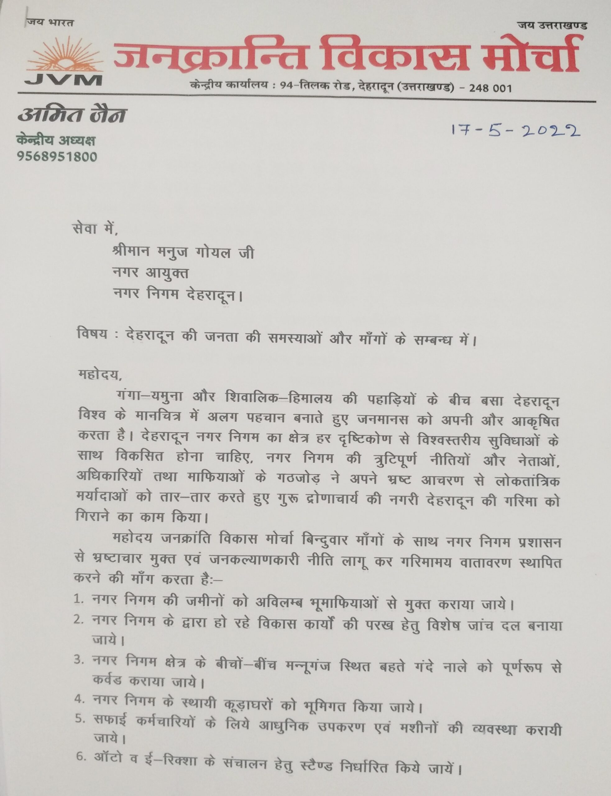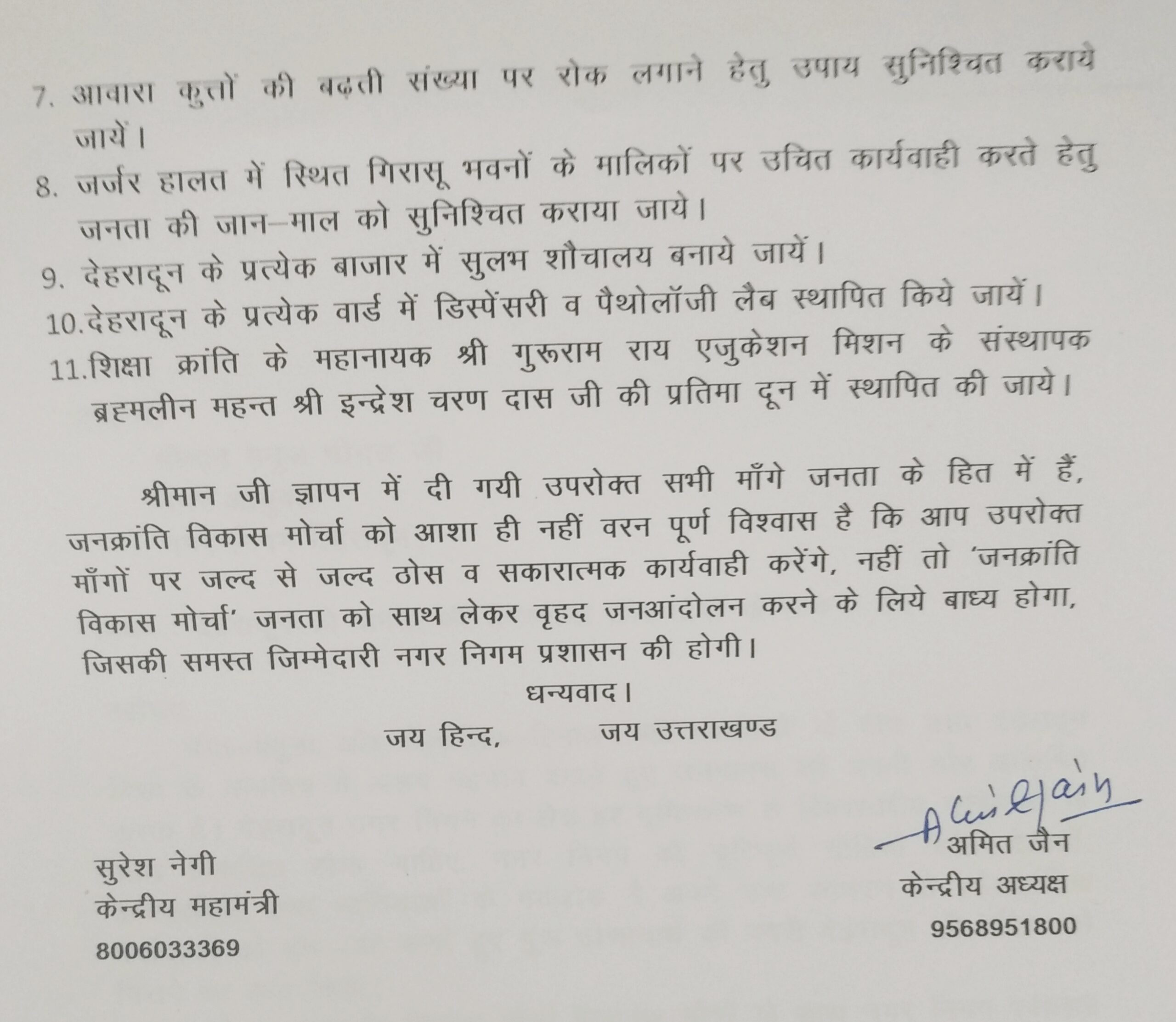 11. शिक्षा क्रांति के महानायक श्री गुरु राम राय एजुकेशन मिशन के संस्थापक ब्रह्मलीन महंत श्री इंद्रेश चरण दास जी की प्रतिमा दून में स्थापित की जाए। श्रीमान जी ज्ञापन में दी गई उपरोक्त सभी मांगे जनता के हित में है। जनक्रांति विकास मोर्चा को आशा ही नहीं वरन पूर्ण विश्वास है कि आप उपरोक्त मांगों पर जल्द से जल्द ठोस व सकारात्मक कार्रवाई करेंगे नहीं तो जनक्रांति विकास मोर्चा जनता को साथ लेकर जनआंदोलन करने के लिए बाध्य होगा जिसकी समस्त जिम्मेदारी नगर निगम प्रशासन की होगी।