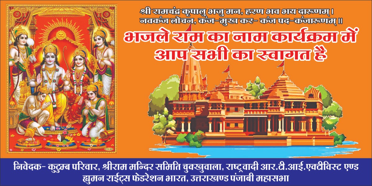 आज कुटुंब परिवार समाजिक संगठन, श्री राम मंदिर समिति चखुवाला एवम राष्ट्रवादी आर.टी.आई एक्टिविस्ट एंड ह्यूमन राइट्स फेडरेसन भारत के सयुंक्त तत्वाधान में हर महीने के अंतिम मंगलवार को श्री राम मंदिर चखुवाला के परिसर में भज लें राम का नाम कार्यक्रम लगातार आयोजित किये जायेंगे।