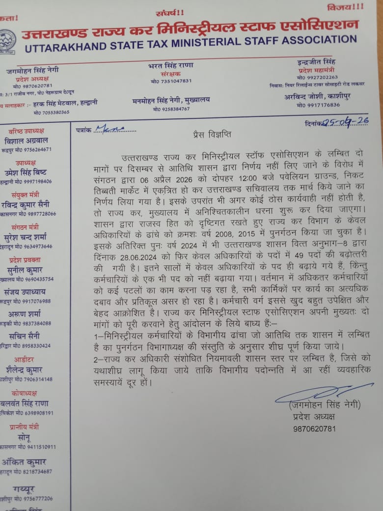 उत्तराखण्ड राज्य कर मिनिस्ट्रीयल स्टॉफ एसोसिएशन के लम्बित दो मागों पर दिसम्बर से आतिथि शासन द्वारा निर्णय नहीं लिए जाने के विरोध में संगठन द्वारा 06 अप्रैल 2026 को दोपहर 12:00 बजे पवेलियन ग्राउन्ड, निकट तिब्बती मार्केट में एकत्रित हो कर उत्तराखण्ड सचिवालय तक मार्च किये जाने का निर्णय लिया गया है। इसके उपरांत भी अगर कोई ठोस कार्यवाही नहीं होती है, तो राज्य कर, मुख्यालय में अनिश्चितकालीन धरना शुरू कर दिया जाएगा। शासन द्वारा राजस्व हित को दृष्टिगत रखते हुए राज्य कर विभाग के केवल अधिकारियों के ढांचे को क्रमशः वर्ष 2008, 2015 में पुनर्गठन किया जा चुका है। इसके अतिरिक्त पुनः वर्ष 2024 में भी उत्तराखण्ड शासन वित्त अनुभाग-8 द्वारा दिनाक 28.06.2024 को फिर केवल अधिकारियों के पदों में 49 पदों की बढ़ोत्तरी की गयी है। इतने सालों में केवल अधिकारियों के पद ही बढ़ाये गये हैं, किन्तु कर्मचारियों के एक भी पद को नहीं बढ़ाया गया। वर्तमान में अधिकतर कर्मचारियों को कई पटलों का काम करना पड़ रहा है, सभी कार्मिकों पर कार्य का अत्यधिक दबाव और प्रतिकूल असर हो रहा है। कर्मचारी वर्ग इससे खुद बहुत उपेक्षित और बेहद आक्रोशित है। राज्य कर मिनिस्ट्रीयल स्टाफ एसोसिएशन अपनी मुख्यतः दो मांगों को पूरी करवाने हेतु आंदोलन के लिये बाध्य हैं:-
