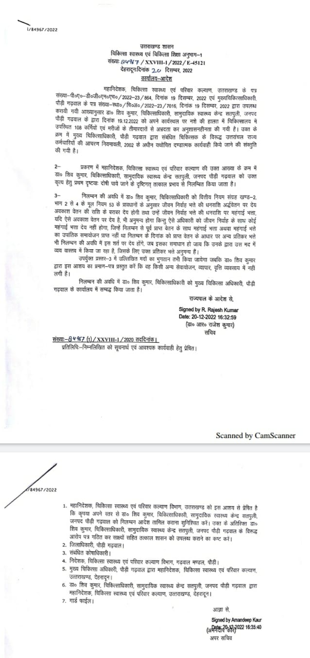 कैबिनेट मंत्री सतपाल महाराज के विधानसभा क्षेत्र स्थित सतपुली में सामुदायिक स्वास्थ्य केंद्र के चिकित्सा अधिकारी डा.शिवकुमार द्वारा मंत्री सतपाल महाराज के विरुद्ध अभद्र भाषा का प्रयोग करने और मरीजों व उनके तिमारदारों से बदसलुखी के मामले का संज्ञान लेते हुए स्वास्थ्य सचिव आर. राजेश कुमार ने मामले की गंभीरता को तत्काल प्रभाव से निलंबित कर दिया है। ज्ञात हो कि 19 दिसंबर को पौड़ी जनपद के सतपुली सामुदायिक स्वास्थ्य केंद्र के चिकित्सा अधिकारी शिवकुमार का मामला उनके संज्ञान में आया था। जिसके बाद निलंबन की कार्यवाही को अंजाम दिया गया।
