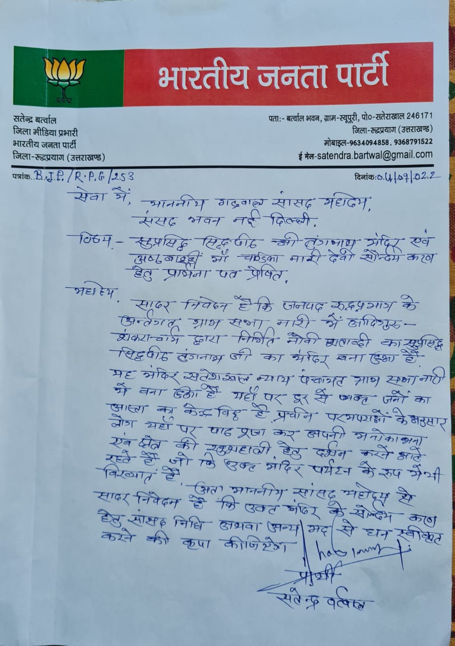 प्रधान घिमतोली बसन्ती देवी ने ग्राम पंचायत घिमतोली के विभिन्न तोको में सोलर लाइट लगाने की मांग की। भाजपा मीडिया प्रभारी सतेन्द्र बर्त्वाल ने श्री तुंगनाथ एवं मा चंडिका नारी मंदिर के सौन्दर्यकरण करने तथा , राजकीय ऐलोपैथिक चिकित्सालय सतेराखाल के उच्चीकरण की मांग की । इस दौरान गढ़वाल सांसद तीरथ सिंह रावत ने कहा कि भाजपा की उत्तराखंड एवं केंद्र की सरकार विकास के प्रति प्रतिबद्ध है।