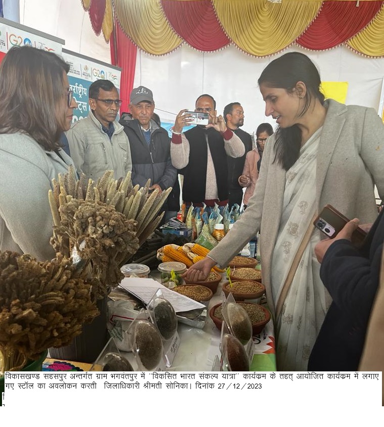 इसी क्रम में आज जनपद विकासखण्ड सहसपुर अन्तर्गत ग्राम भगवंतपुर में जिलाधिकारी श्रीमती सोनिका ने ‘‘विकसित भारत संकल्प यात्रा’’ कार्यक्रम के तहत् आयोजित बहुउद्देशीय शिविर के अन्तर्गत कार्यक्रम स्थल पर लगाए गए विभिन्न विभागों के स्टॉल का अवलोकन करते हुए आवश्यक दिशा-निर्देश दिए। इस दौरान जिलाधिकारी ने निर्देश दिए हैं कि केन्द्र एवं राज्य सरकार की जनकल्याणकारी योजनाओं का लाभ प्रत्येक व्यक्ति तक पंहुचे इसके लिए शिविर में आने वाले जनमानस से विभिन्न योजनाओं हेतु आवेदन की औपचारिकताएं पूर्ण करवाई जाएं तथा सरकार की योजनाओं से लभान्वित करें तथा जो व्यक्ति योजनाओं से लाभान्वित हो रहे हैं उनसे अन्य लोगों को भी जागरूक करने का अनुरोध किया ताकि अन्य लोग भी सरकार की जनकल्याणाकरी योजनाओं से संतिप्त हो सके।