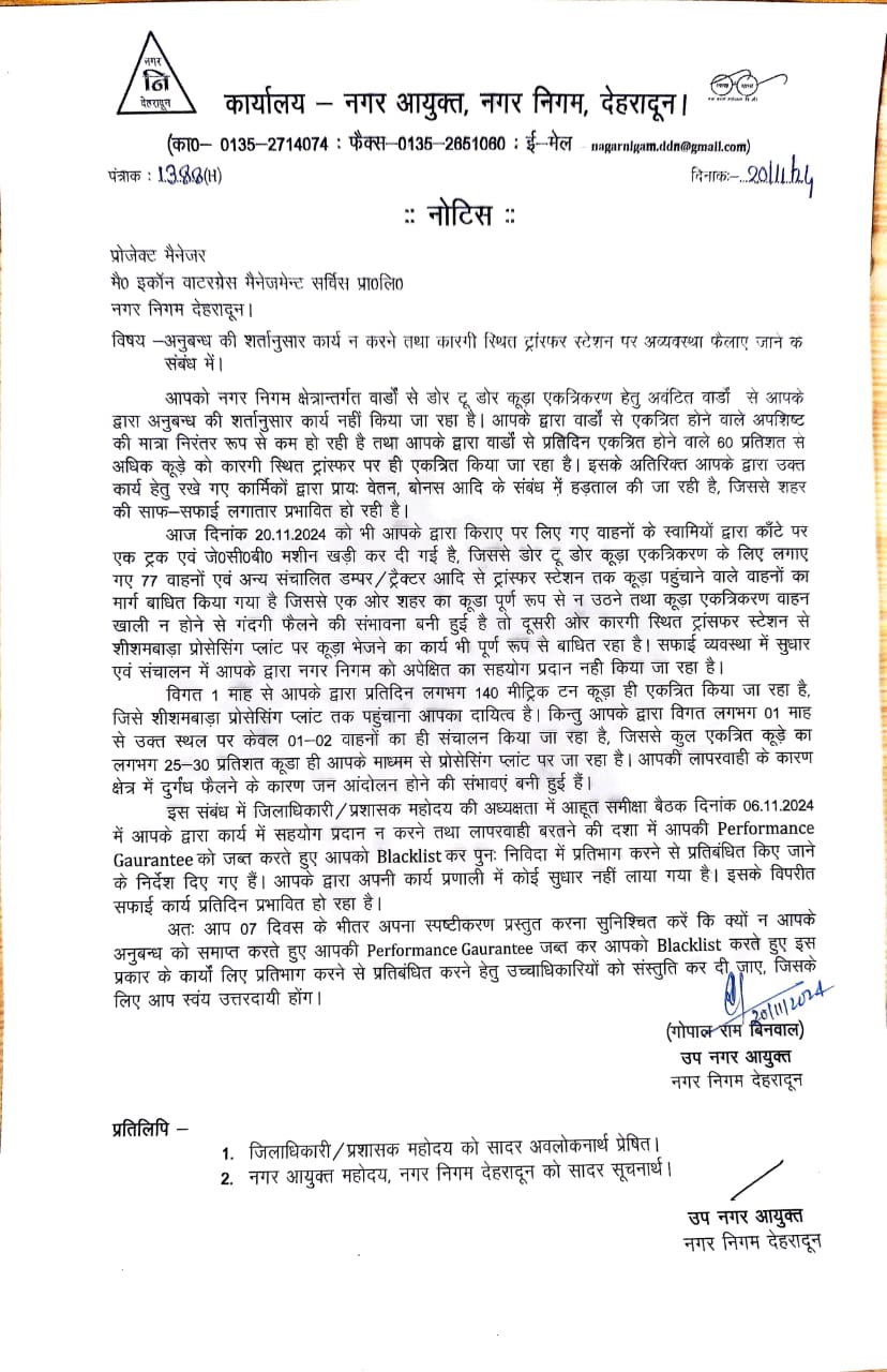 शहर में कूड़ा उठान व्यवस्था में लापरवाही बरतने पर इकॉन वाटरग्रेस मैनेजमेंट को नगर निगम द्वारा नोटिस प्रेषित कर 7 दिन के भीतर मांगा जवाब, स्पष्ट जवाब न देने तथा कूड़ा उठा व्यवस्था में सहयोग न करने पर सिक्योरिटी जब्त करने तथा ब्लैक लिस्ट करने की चेतावनी ।करगी ट्रांसफर स्टेशन में शर्तों के अनुसार कार्य न करने तथा अव्यवस्थाएं फैलाई जाने के व डोर टू डोर कूड़ा उठान में लापरवाही के संबंध में दिया गया नोटिस।