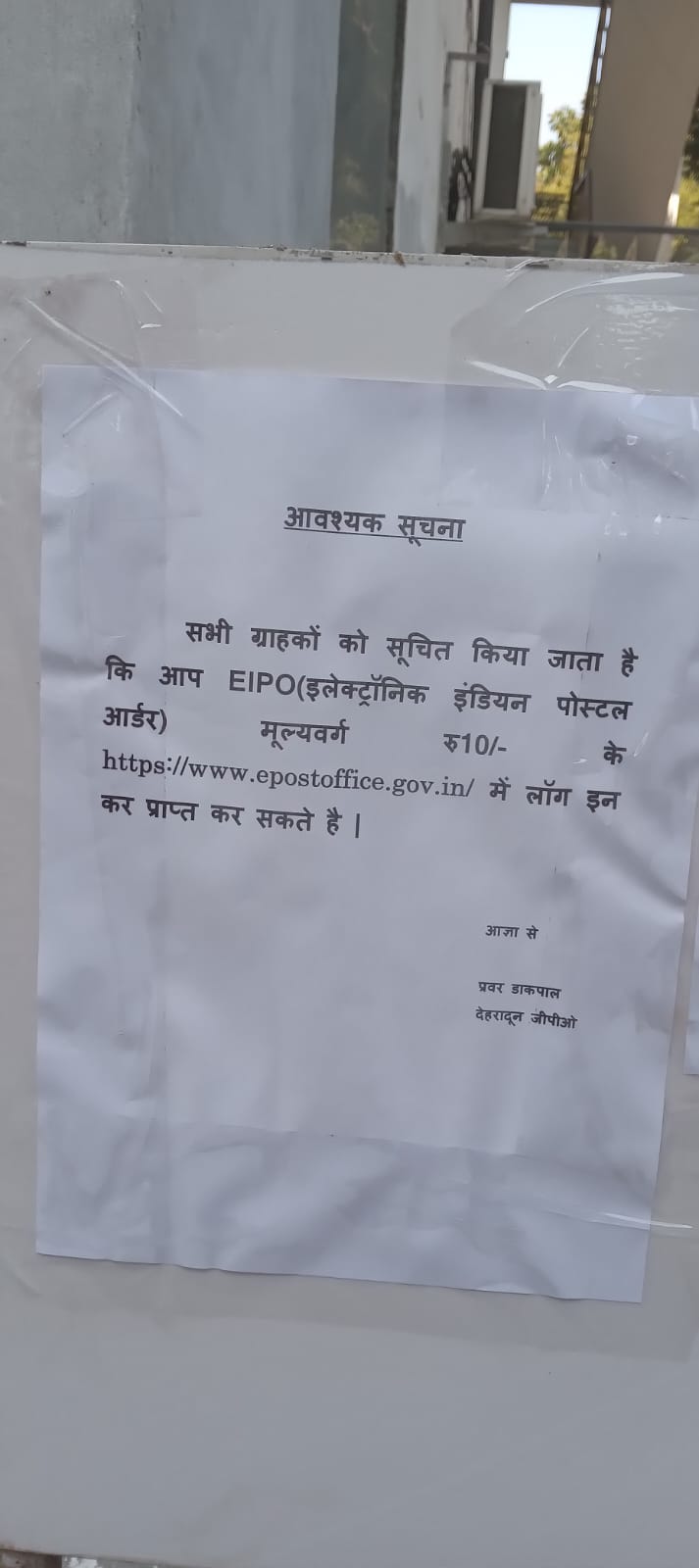 (देहरादून डाक घर में 10 रूपये के i. P. O उपलब्ध करवाने के लिये)