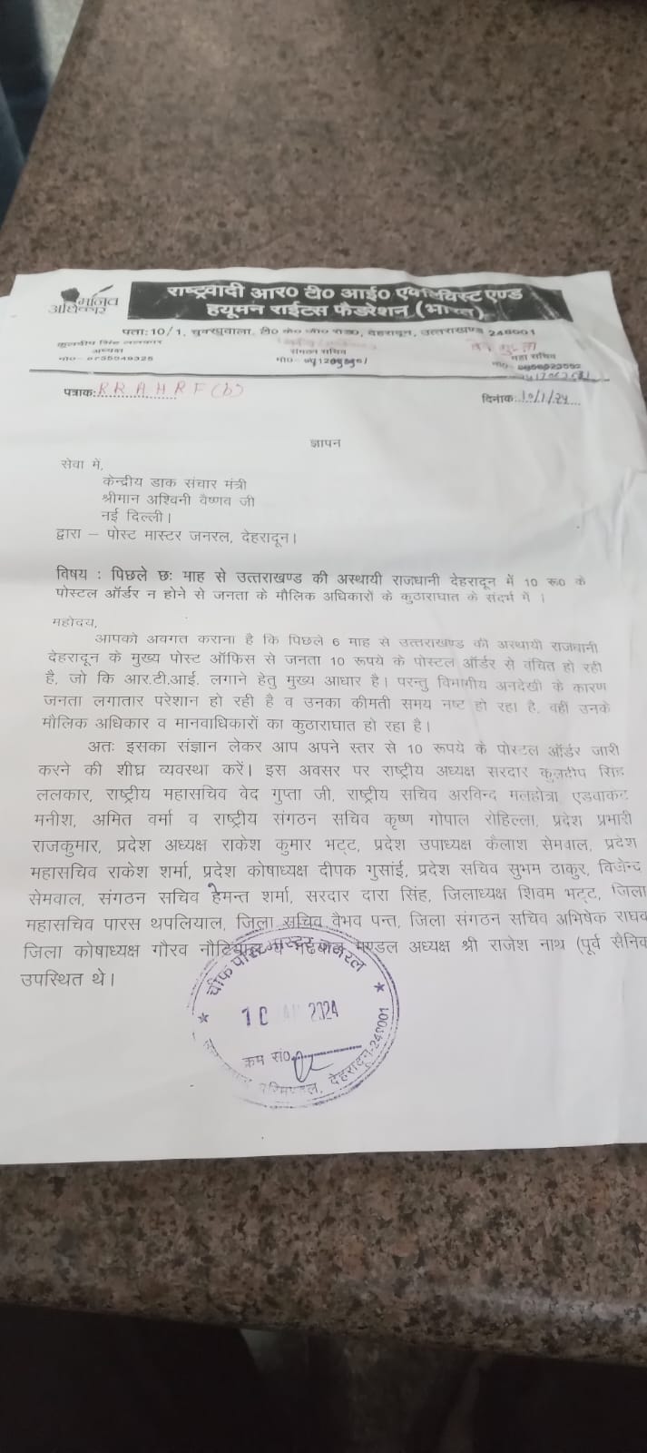 आज राष्ट्रवादी आर टी आई एक्टिविस्ट एंड ह्यूमन राइट्स फेडरेसन भारत ने केंद्रीय डाक तार मंत्री अश्वनी वैस्नव का आभार जताया की उन्होंने संगठन के द्वारा 10 जनवरी 24 को प्रेषित ज्ञापन जो की चीफ पोस्ट मास्टर जरनल के माध्यम से देहरादून में अनु उपलब्ध 10 रूपये के पोस्टल ऑडर जो की 7 माह से उपलब्ध नहीं थे। जनता को उपलब्ध करवाने के लिये केंद्र सरकार व केंद्रीय मंत्री का आभार जता कर धन्यवाद किया।