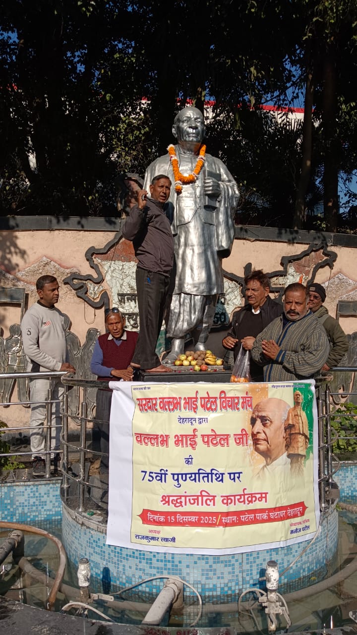 सरदार वल्लभ भाई पटेल विचार मंच ने सरदार वल्ल्भ भाई पटेल की पुण्यतिथि में घंटाघर के पटेल पार्क में पटेल की मूर्ति को गंगा जल, दूध दही से स्नान कराकर, और माल्यार्पण कर फल वितरण का कार्यक्रम किया।