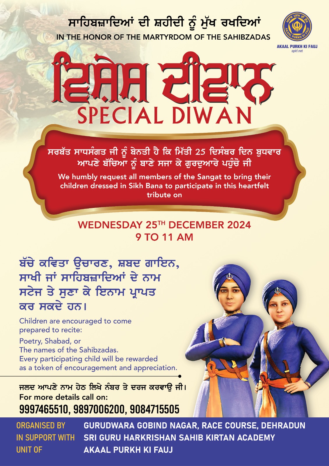 आज गुरुद्वारा गोबिंद नगर रेस कोर्स में सुबह 9:00 से 11:00 बजे तक विशेष दीवान लगाया गया, जिसमें गुरुद्वारा गोबिंद नगर रेस कोर्स, श्री हर कृष्ण सहिब कीर्तन एकेडमी, श्री सुखमनी सहिब सेवा सोसाइटी के संयुक्त प्रयास से विशेष दीवान में छोटे छोटे बच्चों ने गुरु इतिहास, सहिब जादौ की शआदत के इतिहास के बारे में बताया गया।