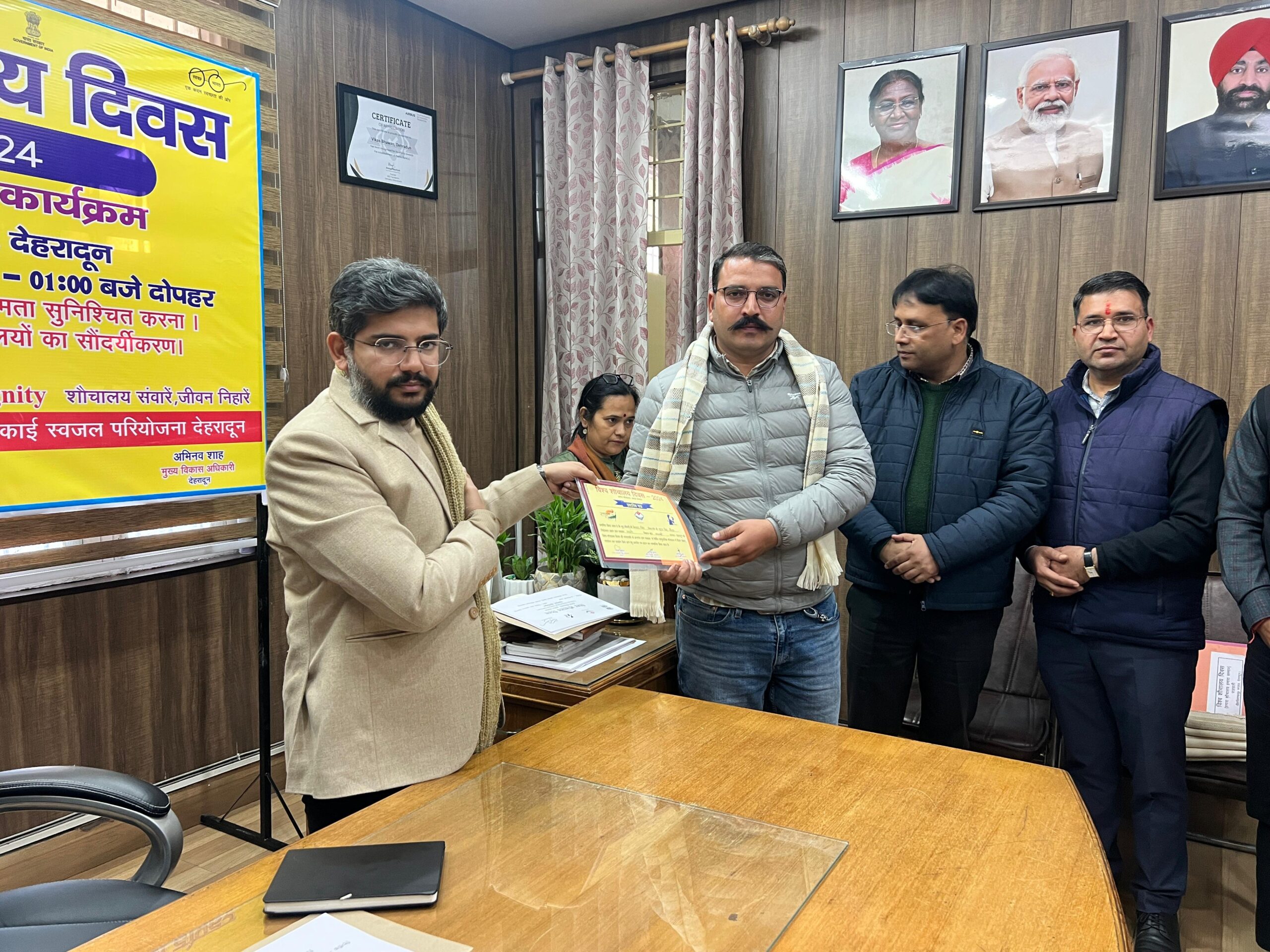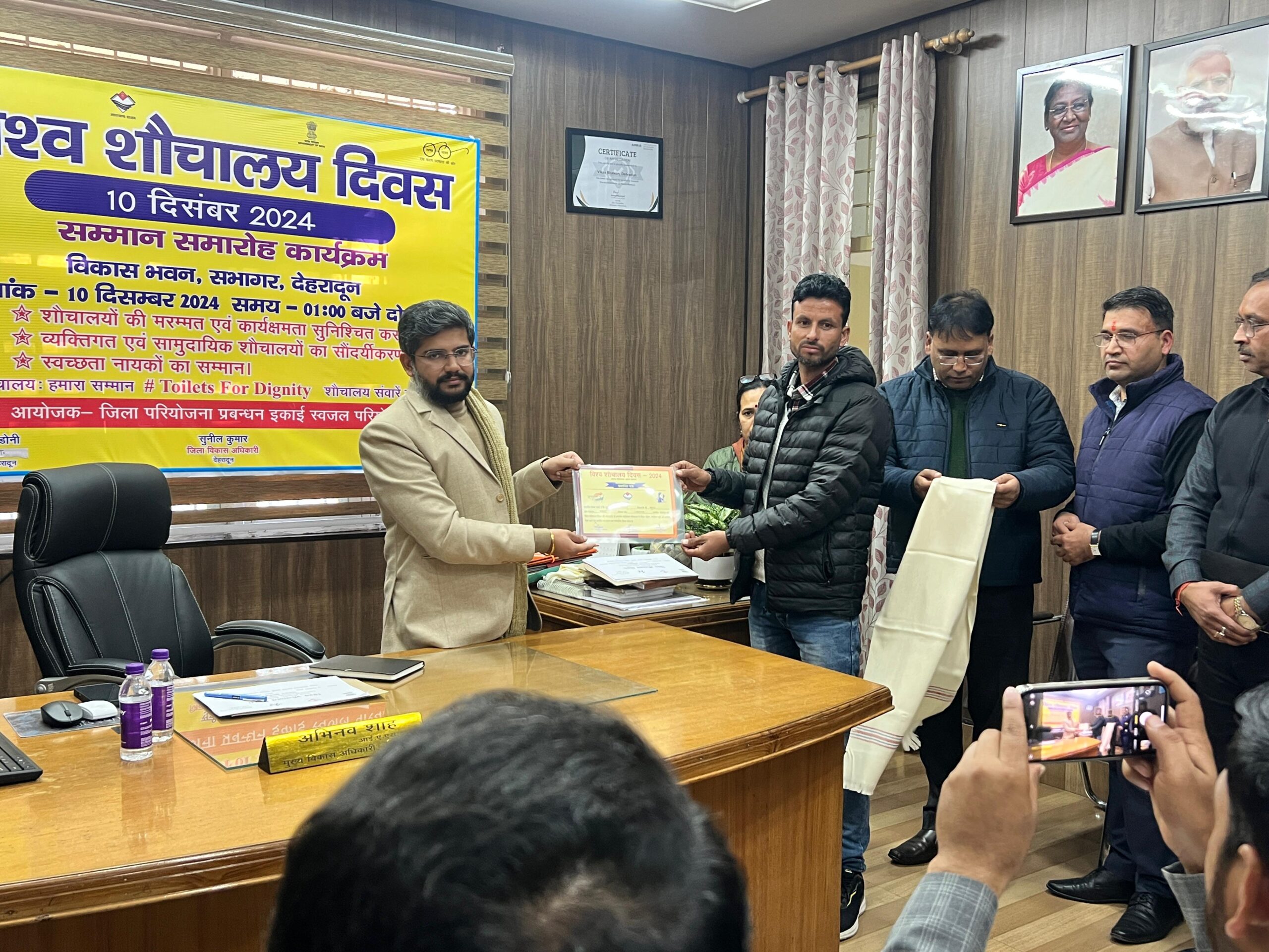 विश्व मानवाधिकार दिवस के अवसर पर मुख्य मुख्य विकास अधिकारी अभिनव शाह ने विकास भवन देहरादून में 5 व्यक्तिगत शौचालय के लाभार्थियों तथा 3 निर्वतमान ग्राम प्रधानों को सम्मानित किया गया। सर्वप्रथम परियोजना प्रबन्धक स्वजल द्वारा अवगत कराया गया कि विगत वर्षों की भांति इस वर्ष भी सुरक्षित / स्वच्छ शौचालयों के उपयोग, स्वच्छता की प्रांसगिकता एवं उन तक पहुंच बनाने में जन-जागरूकता के उद्देश्य से विश्व शौचालय दिवसष् 2024 इस वर्ष दिनांक 19 नवम्बर 2024 से ‘मानवाधिकार दिवस’ 10 दिसम्बर 2024 तक अभियान के रूप में संचालित किया गया है।