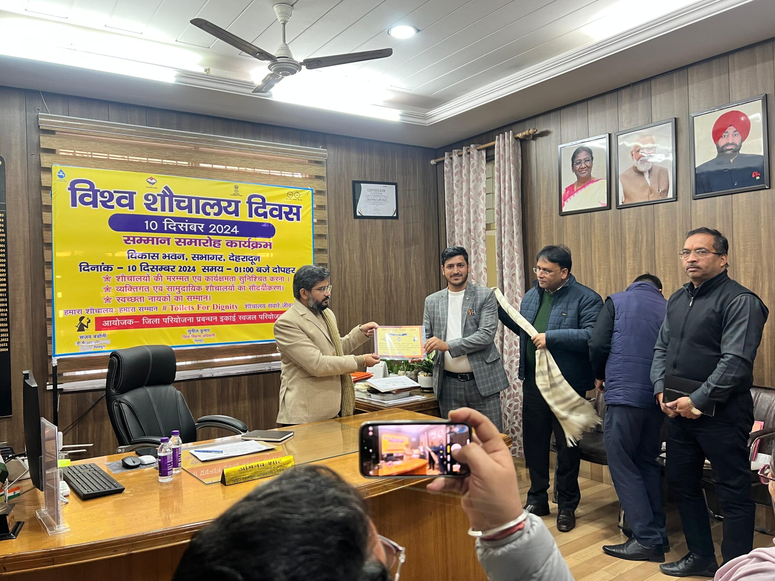 विश्व मानवाधिकार दिवस के अवसर पर मुख्य मुख्य विकास अधिकारी अभिनव शाह ने विकास भवन देहरादून में 5 व्यक्तिगत शौचालय के लाभार्थियों तथा 3 निर्वतमान ग्राम प्रधानों को सम्मानित किया गया। सर्वप्रथम परियोजना प्रबन्धक स्वजल द्वारा अवगत कराया गया कि विगत वर्षों की भांति इस वर्ष भी सुरक्षित / स्वच्छ शौचालयों के उपयोग, स्वच्छता की प्रांसगिकता एवं उन तक पहुंच बनाने में जन-जागरूकता के उद्देश्य से विश्व शौचालय दिवसष् 2024 इस वर्ष दिनांक 19 नवम्बर 2024 से ‘मानवाधिकार दिवस’ 10 दिसम्बर 2024 तक अभियान के रूप में संचालित किया गया है।