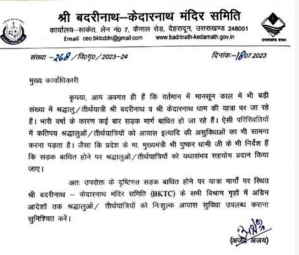 बीकेटीसी अध्यक्ष अजेंद्र अजय ने मंगलवार को इस संबंध में आदेश जारी किए हैं। आदेश में कहा गया है कि वर्तमान में मानसून काल में भी बड़ी संख्या में श्रद्धालु/ तीर्थयात्री श्री बदरीनाथ व श्री केदारनाथ धाम की यात्रा पर जा रहे हैं। भारी वर्षा के कारण कई बार सड़क मार्ग बाधित हो जा रहे हैं। ऐसी परिस्थितियों में कतिपय श्रद्धालुओं/ तीर्थ यात्रियों को आवास इत्यादि की असुविधाओं का भी सामना करना पड़ता है।