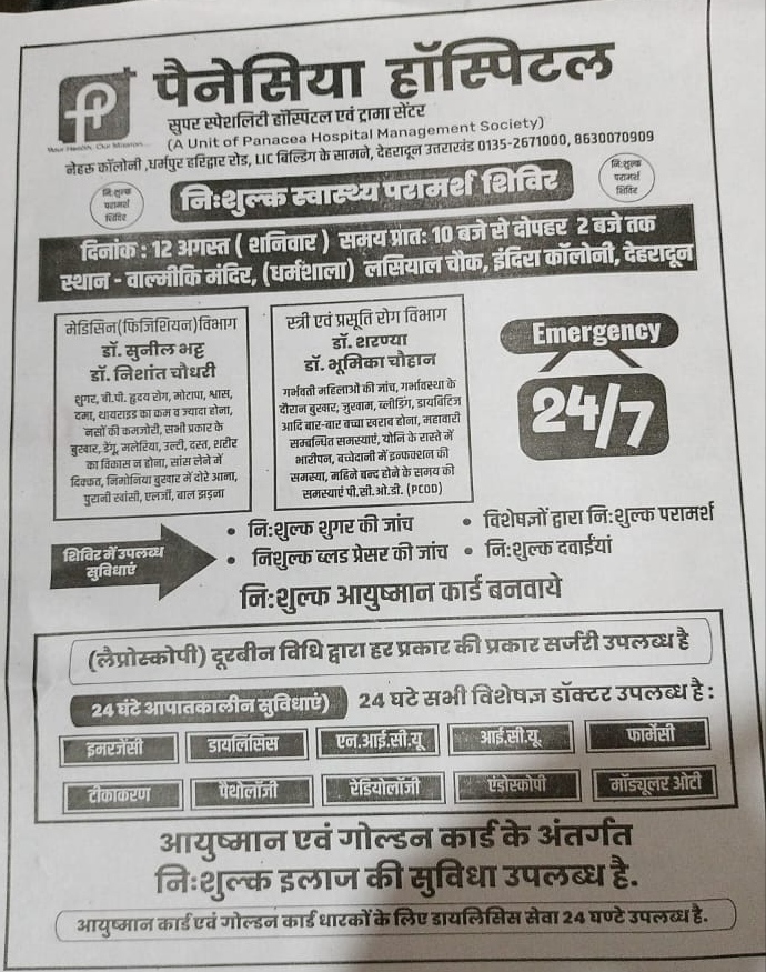 आज चुक्खूवाला इंद्राकालोनी के वाल्मीकि मंदिर धर्मशाला में पेनसिया हॉस्पिटल ने बी.जे.पी करनपुर मण्डल महानगर की मंत्री कोमल गेहलोत एवम सुनील राणा जी के विशेष प्रयास से निशुल्क स्वास्थ्य परामर्श शिविर लगाया।