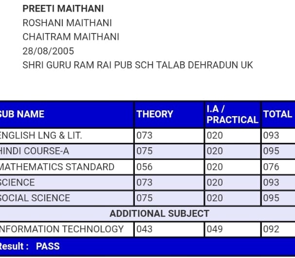 सीबीएसई इंटरमीडियट के गुरुराम राय इंटर कॉलेज तालाब से प्रीति मैठानी ने प्रथम स्थान प्राप्त किया।
