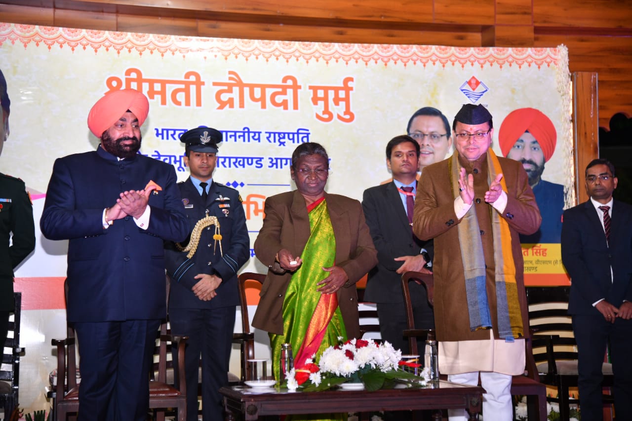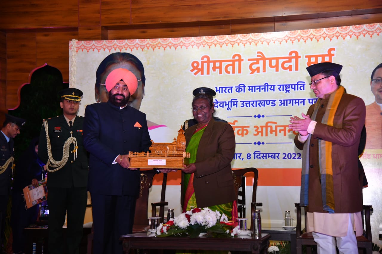 राज्यपाल लेफ्टिनेंट जनरल गुरमीत सिंह (से.नि..) ने राष्ट्रपति का देवभूमि उत्तराखण्ड की जनता की ओर से स्वागत और अभिनंदन करते हुए कहा कि माननीय राष्ट्रपति जी के उत्तराखण्ड आगमन से यहां का कण-कण स्वयं को ऊर्जावान और गौरवशाली महसूस कर रहा है। राष्ट्रपति जी पूरे देश की बेटियों, बहनों और माताओं के लिए प्रेरणा का सर्वोच्च स्रोत हैं। देवभूमि उत्तराखण्ड की यह भूमि गंगा-यमुना जैसी पवित्र नदियों का उद्गम है। यहाँ श्री बद्रीनाथ जी और श्री केदारनाथ जी के पावन धाम हैं। गुरु गोबिन्द सिंह जी की तपस्थली हेमकुंड साहिब और जागेश्वर धाम हैं। दो-दो अन्तर्राष्ट्रीय सीमाओं से घिरा यह प्रदेश देवभूमि है, वीरभूमि है, सैन्य भूमि है। यहाँ अधिकांश परिवारों का कोई न कोई सदस्य सेनाओं में या किसी पैरामिलिट्री फोर्स में शामिल हो कर, देश की रक्षा में लगा हुआ है।