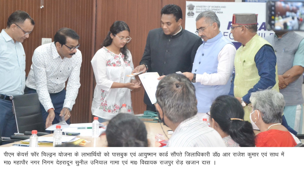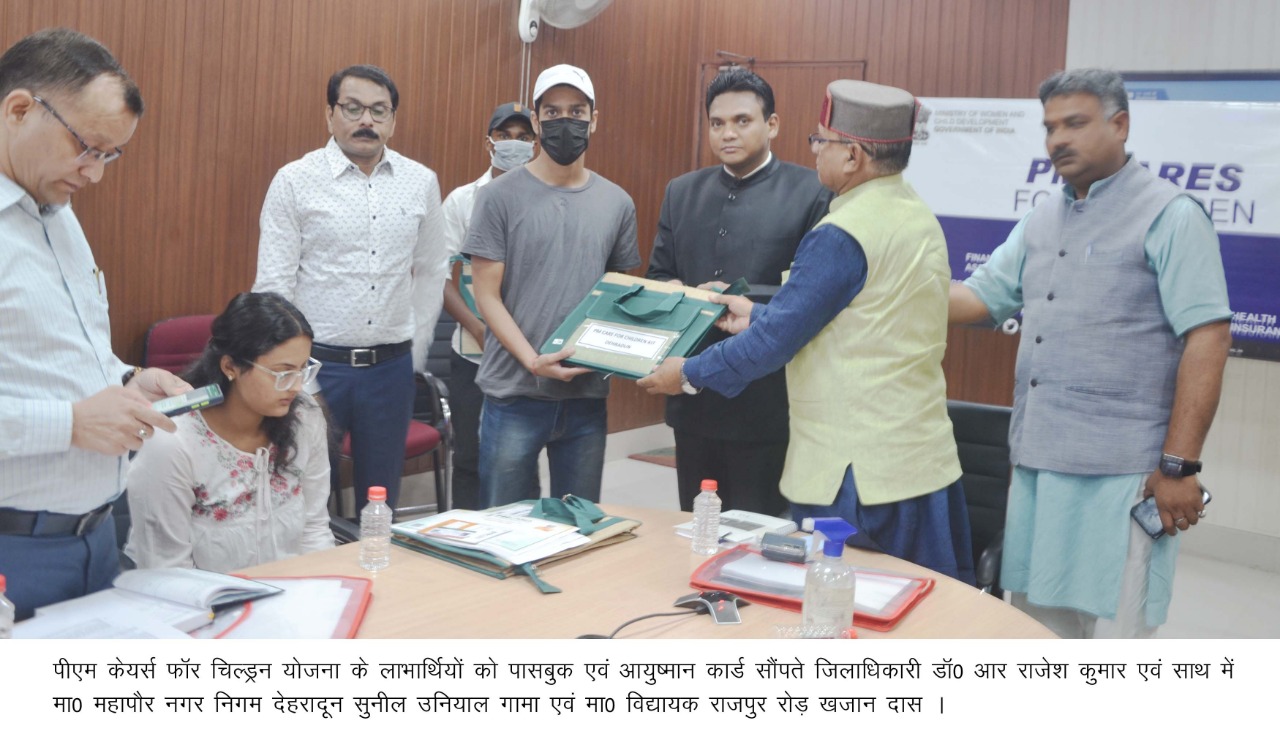 आज एनआईसी सभागार देहरादून में पीएम केयर फाॅर चिल्ड्रन योजना के लाभार्थी बच्चों को जिलाधिकारी डाॅ0 आर राजेश कुमार ने पासबुक एवं आयुष्मान कार्ड वितरित किए गए। जिलाधिकारी डाॅ0 आर राजेश कुमार ने कहा कि पीएम केयर फाॅर चिल्ड्रन योजना के लभार्थियों को माननीय प्रधानमंत्री की मंशा के अनुरूप पीएम केयर से आच्छादित सभी बच्चों को शिक्षा, स्वास्थ्य, छात्रवृत्ति, उच्च कक्षाओं में प्रवेश के लिए किसी प्रकार की असुविधा होने नही दी जाएगी। आज एनआईसी सभागार आराध्या राना, अभिषेक गौड़, प्रिया जोशी, रिया भट्ट, सानवी राना, सम्राज सूद,शौर्य सूद, विवेक भट्ट को पासबुक एवं आयुष्मान कार्ड वितरित किए गए।