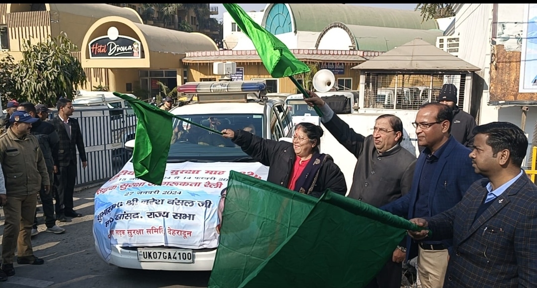 राष्ट्रीय सड़क सुरक्षा माह 2024, में सड़क सुरक्षा जागरूकता कार्यक्रम की श्रृंखलाओं में आज आयोजित सड़क सुरक्षा रैली माननीय राज्यसभा सांसद श्री नरेश बंसल द्वारा होटल द्रोण से हरी झण्डी दिखाकर रवाना किया। यह जागरूकता रैली होटल द्रोण से संभागीय परिवहन विभाग के कार्यालय राजपुर रोड तक गई। उन्होंने कहा कि सड़क सुरक्षा हेतु जागरूकता की आवश्यकता है, प्रत्येक वर्ष लाखों लोग रैस ड्राईव के कारण दुर्घटना का शिकार होते हैं, लोगों का जीवन बचाने के लिए जागरूकता की आवश्यकता है इसलिए इस रैली का फ्लैग ऑफ किया गया हैै। कहा कि सरकार का यही प्रयास है कि दुर्घटनाओं में 50 प्रतिशत् से अधिक की कमी लाई जाए इसके लिए सड़कों का निर्माण एवं सुरक्षात्मक उपाय अपनाये जा रहे है। आम आदमी को जागरूक होने की आवश्यकता है।