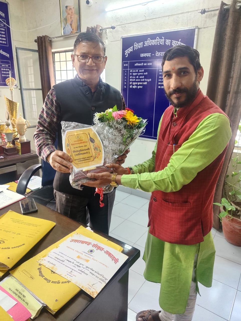 उत्तराखंड संस्कृत अकादमी हरिद्वार द्वारा आयोजित राज्य स्तरीय संस्कृत छात्र प्रतियोगिता में देहरादून जनपद के कनिष्ठ वर्ग में उत्तम प्रदर्शन करने पर देहरादून जनपद को वैजयंती पुरस्कार से नवाजा गया यह पुरस्कार मुख्य शिक्षा अधिकारी कार्यालय में रखा गया। जनपद सहसंयोजक आचार्य मनोज शर्मा ने यह पुरस्कार मुख्य शिक्षा अधिकारी प्रदीप कुमार रावत को प्रदान किया ।मुख्य शिक्षा अधिकारी ने सभी शिक्षकों एवं जनपद संयोजक डॉक्टर गीता राम नौटियाल,सहसंयोजक आचार्य मनोज शर्मा को इसके लिए बधाई दी।