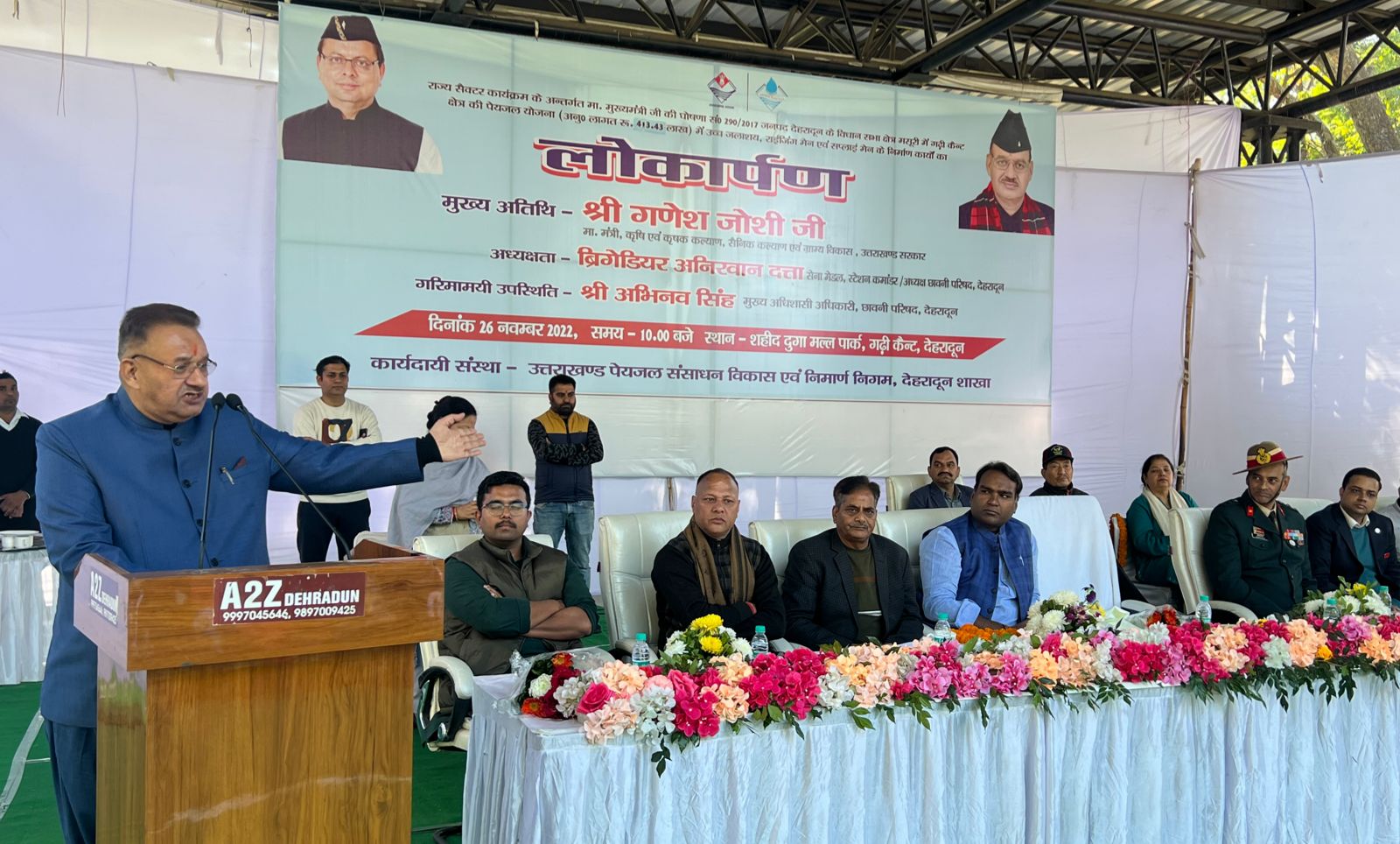 प्रदेश के कृषि, कृषक कल्याण, सैनिक कल्याण एवं ग्राम्य विकास मंत्री गणेश जोशी ने शनिवार को शहीद दुर्गामल्ल पार्क गढ़ी कैंट में मुख्यमंत्री घोषणा के अंतर्गत मसूरी विधानसभा क्षेत्र के गढ़ी कैंट में पेयजल योजना के तहत रू० 413.13 लाख की लागत से निर्मित उच्च जलाशय, राइजिंग मेन और सप्लाई मेन के निर्माण कार्यों का लोकार्पण किया ।