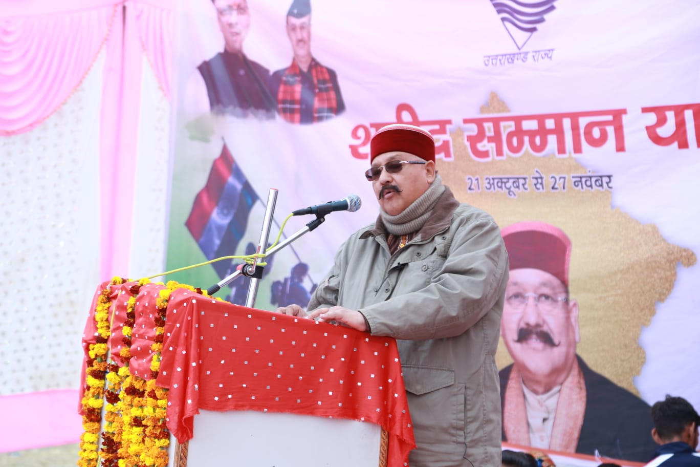 उन्होने कहा कि देहरादून में निर्मित होने वाले पांचवें धाम सैन्य धाम के निर्माण हेतु प्रत्येक शहीद के गांव के आंगन से पवित्र माटी सैनिक सम्मान रथ यात्रा द्वारा ताम्र कलश में ले जायी जा रही है। हमारे चार विकास खंडों के शहीदों के गांव के आँगन से भी मिट्टी को ताम्र कलशों के माध्यम से सैन्य धाम पहुंचाया जायेगा जो कि हमारे क्षेत्र के लिए सम्मान की बात है।