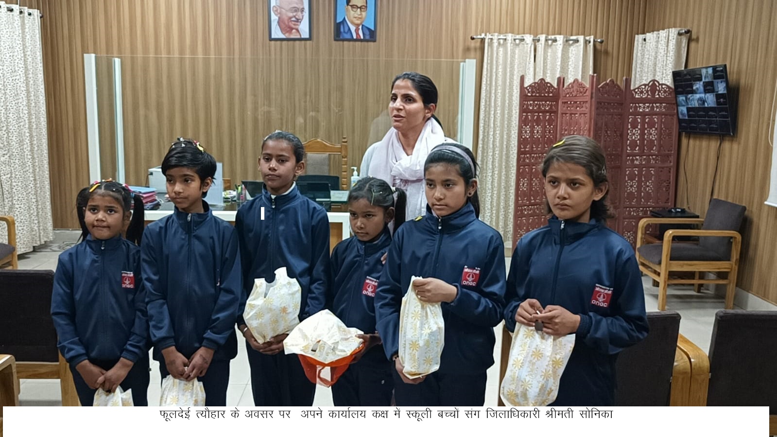 उत्तराखण्ड के लोक पर्व फूलदेयी के अवसर पर स्कूली बच्चों ने जिलाधिकारी कार्यालय कक्ष में देहली पर फूल चढाकर जिलाधिकारी श्रीमती सोनिका को फूलदेयी त्यौहार की शुभकामनाएं दी। इस अवसर पर जिलाधिकारी ने स्कूली बच्चों को चॉकलेट दी।