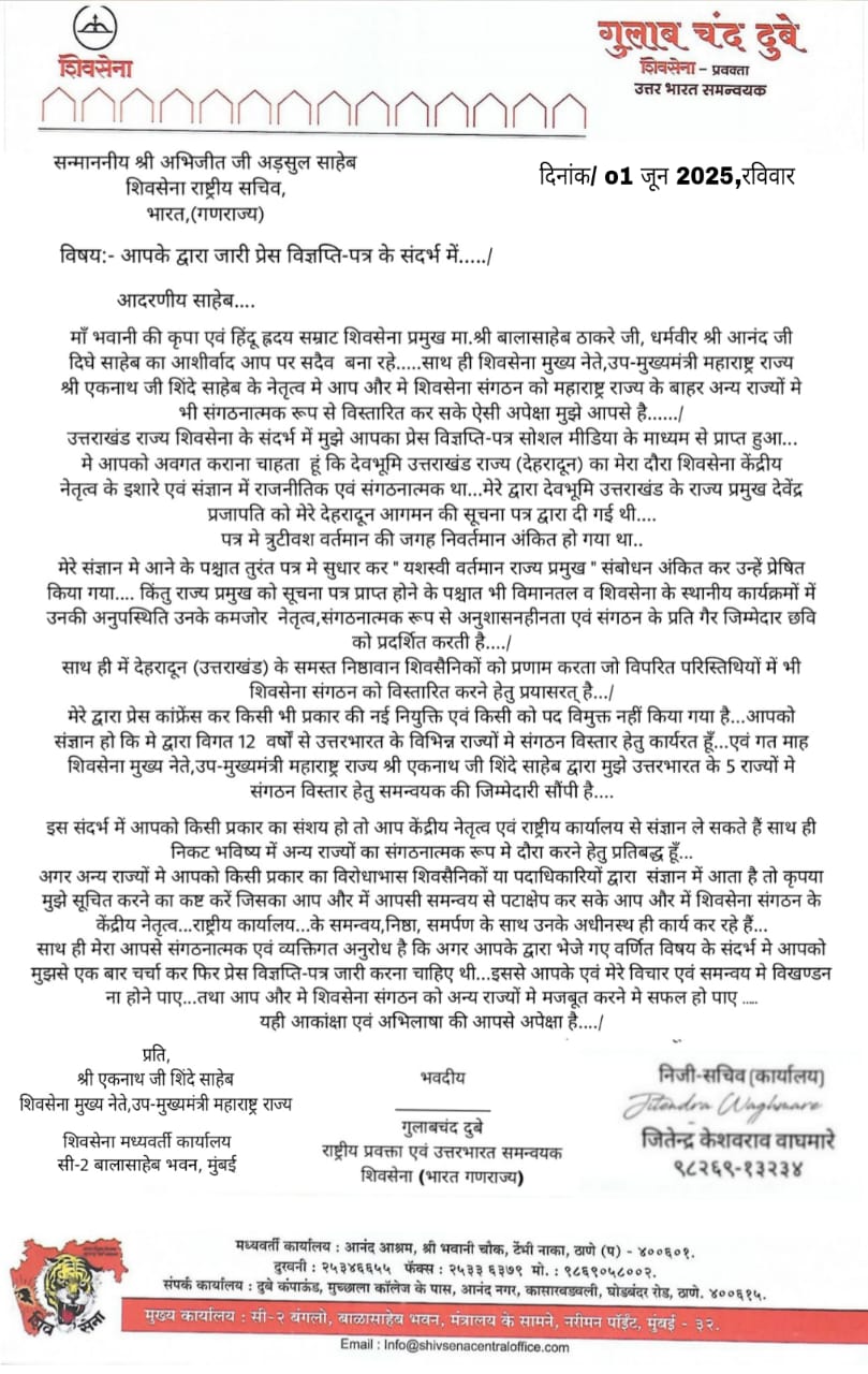 शिवसेना के उत्तराखंड प्रदेश प्रभारी राहुल चौहान ने आज अवगत करवाया है कि शिवसेना के माननीय राष्ट्रीय प्रवक्ता एवं उत्तर भारत समन्वयक आदरणीय श्री गुलाब चन्द दुबे जी द्वारा दिनांक 01.06.2025 को शिवसेना राष्ट्रीय सचिव श्री अभिजीत अडसुल जी को एक पत्र के माध्यम से यह स्पष्ट किया है कि श्रीगुलाब चन्द दुबे जी का दिनांक 25.05.2025 को उत्तराखंड राज्य का त्रिदिवसीय दौरा राष्ट्रीय नेतृत्व के निर्देशानुसार ही हुआ था एवं यह एक आधिकारिक एवं राजनीतिक दौरा था किंतु इस दौरे के दौरान पूर्व लिखित सूचना के बाबजूद उत्तराखंड राज्य प्रमुख श्री देवेन्द्र प्रजापति की पूर्णरूपेण अनुपस्थिति राज्य प्रमुख के कमजोर नेतृत्व एवं अनुशासनहीनता का प्रत्यक्ष परिचायक हैं।