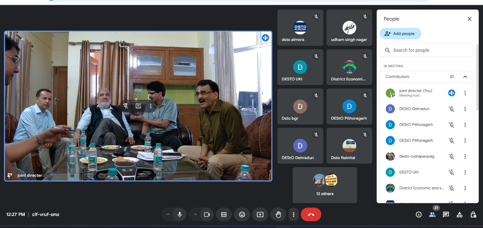 बैठक में श्री सुशील कुमार, निदेशक एवं विभागाध्यक्ष, बीस सूत्री कार्यक्रम, श्री रतन सिंह संयुक्त निदेशक (एनआईसी), श्री जे०सी० चन्दोला, शोध अधिकारी, मण्डलीय संयुक्त निदेशक, समस्त जिला अर्थ एवं संख्याधिकारियों द्वारा प्रतिभाग किया गया।