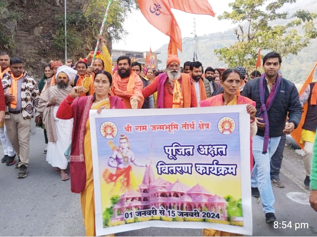 इस दौरान श्री राम जन्म भूमि अक्षत वितरण जिला अभियान समिति एवं पूज्य संतो, महात्माओं द्वारा पूजित अक्षत की शोभा यात्रा रुद्रप्रयाग जनपद मुख्यालय में गुलाबराय मैदान से मुख्य बाजार होते हुए बद्रीनाथ मार्ग पेट्रोल पंप तक निकाली गई।