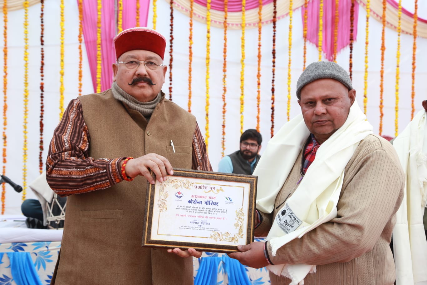 कार्यक्रम के दौरान कैबिनेट मंत्री एवं क्षेत्रीय विधायक सतपाल महाराज एवं पूर्व मंत्री श्रीमती अमृता रावत ने विधानसभा क्षेत्र में कोरोना काल के दौरान उत्कृष्ट कार्य करने वाले आंगनवाड़ी, सहायिकाओं, आशा कार्यकत्रियों एवं महिला मंगल दल को अंगवस्त्र एवं प्रशस्ति पत्र देकर सम्मानित किया।