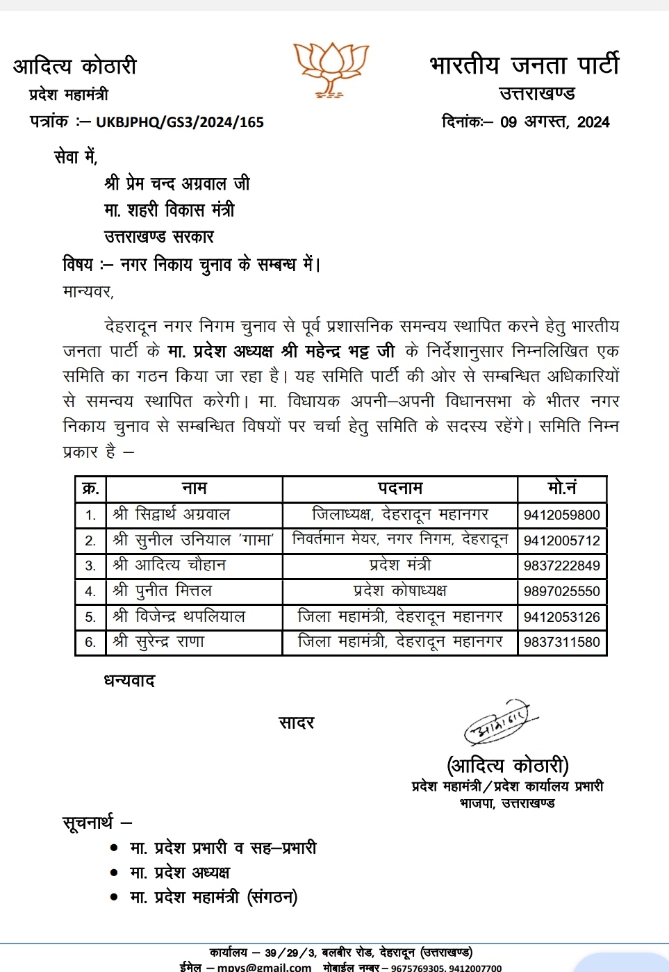 प्रदेश अध्यक्ष श्री महेंद्र भट्ट जी ने नगर निकाय चुनाव के लिए प्रशासनिक समन्वय समिति का गठन किया।