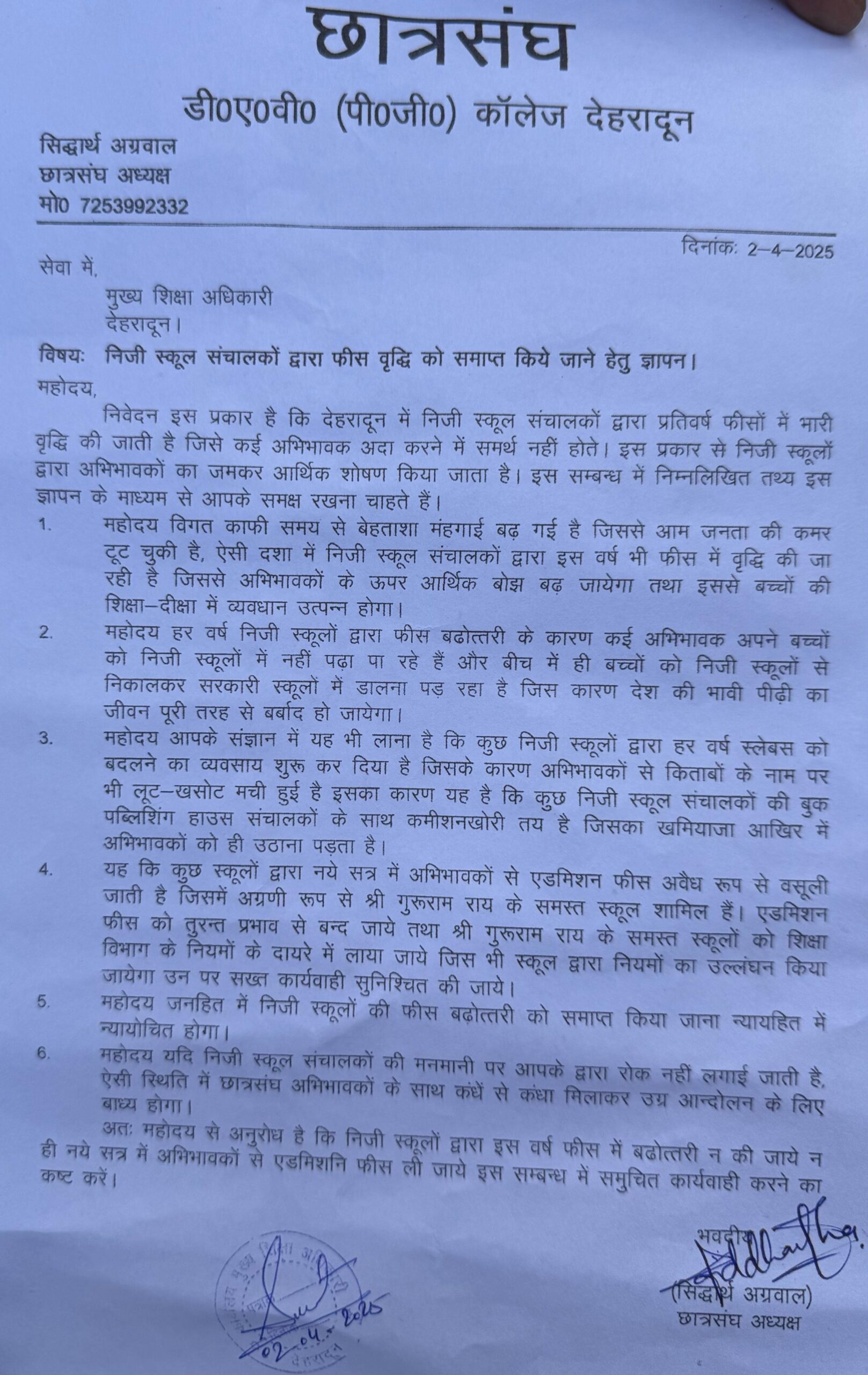 आज डीएवी पीजी कॉलेज छात्रसंघ अध्यक्ष सिद्धार्थ अग्रवाल के नेतृत्व में एन॰एस॰यू॰आई॰ कार्यकर्ताओं द्वारा मुख्य शिक्षाधिकारी कार्यालय देहरादून में निजी स्कूलों की मनमानी के खिलाफ कार्यवाही करने हेतु मुख्य शिक्षाधिकारी महोदय को ज्ञापन दिया गया।