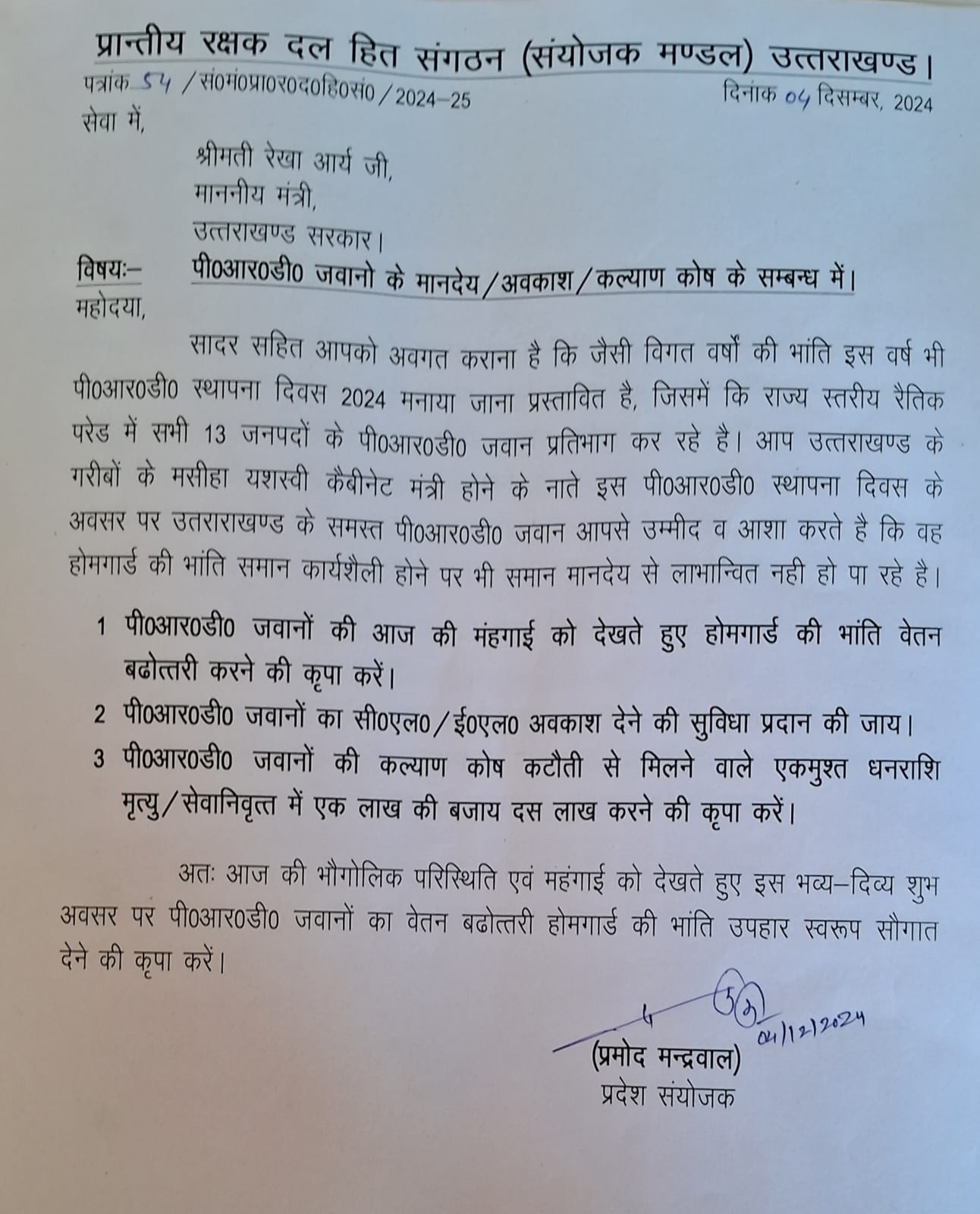 इन बिन्दुओं पर सकारात्मक उद्घोषणा करेंगे और संगठन के प्रदेश संयोजक ने स्थापना दिवस के दिन पीआरडी जवानों का एक दिवसीय अवकाश रहे का भी माननीय मंत्री के समक्ष बात रखी कि ब्लॉक कमांडर हल्का सरदारों व समस्त प्रान्तीय रक्षक दल के जवान भी पीआरडी स्थापना दिवस के दिन विभागीय निर्देश दिए जाए ताकि सभी प्रांतीय रक्षक दल के जवान स्थापना दिवस में प्रतिभाग कर सके, उसके लिए भी माननीय मंत्री जी ने आश्वासन दिया कि एक दिन का अवकाश स्थापना दिवस के दिन और अगले वर्ष 2025 से पीआरडी स्थापना दिवस सभी जनपदों में जनपदवार मनाया जाएगा,जिसके लिए संगठन के प्रतिनिधि ने माननीय मंत्री जी का बहुत-बहुत धन्यवाद और आभार जताया।