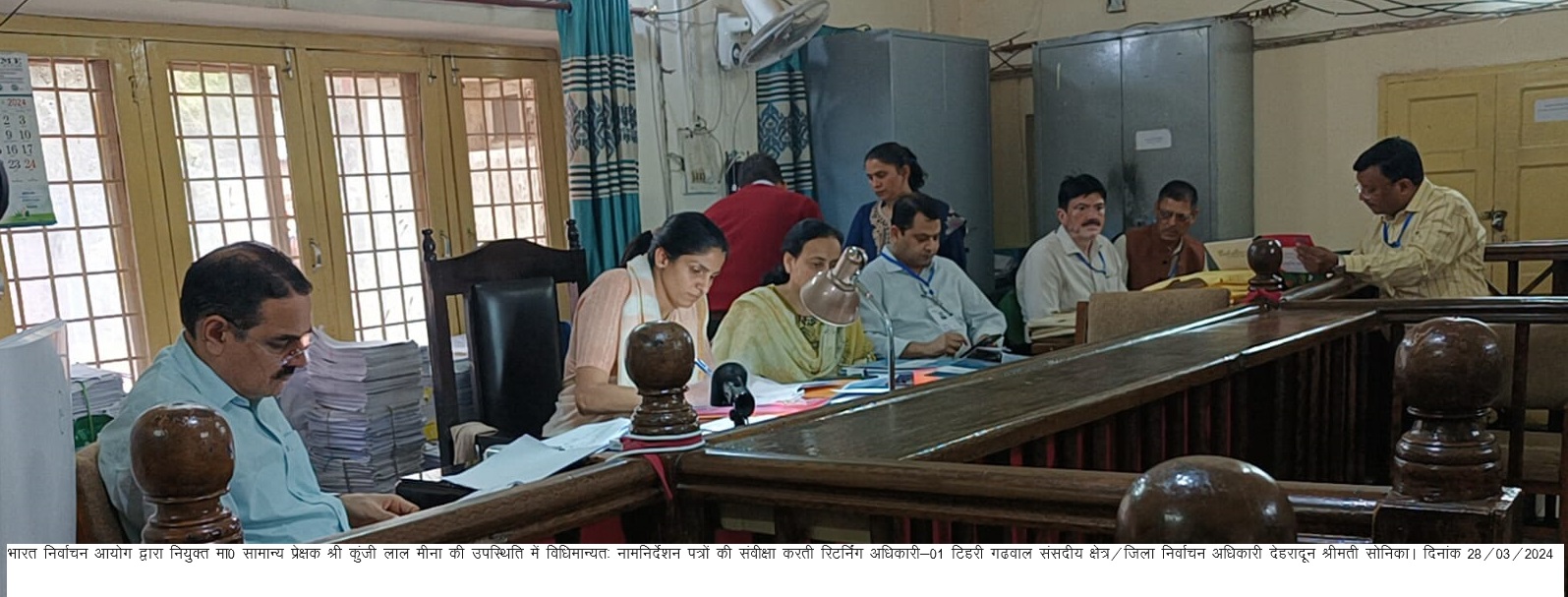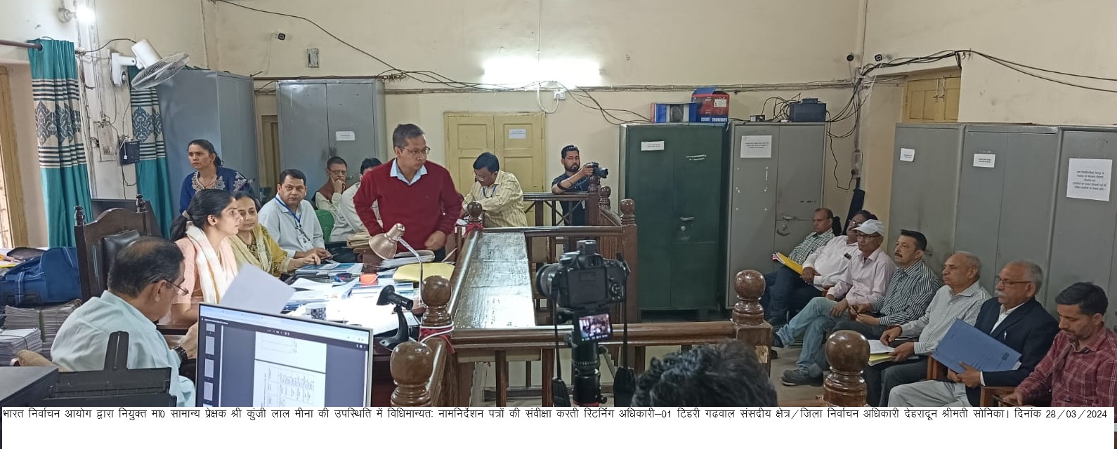 आज सामान्य प्रेक्षक 01-टिहरी गढवाल संसदीय क्षेत्र श्री कुजीं लाल मीना की उपस्थिति में निर्वाचन अधिकारी देहरादून/जिलाधिकारी श्रीमती सोनिका ने अभ्यर्थियों/प्रतिनिधियों के सम्मुख विधिमान्यतः नामनिर्देशन पत्रों की गहनता से जांच की।