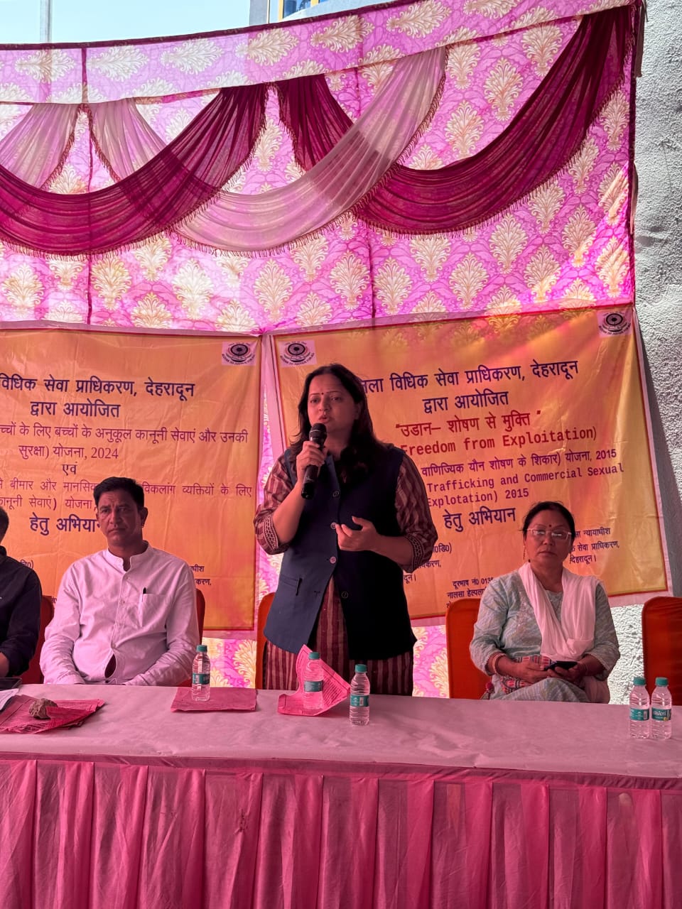 राज्य विधिक सेवा प्राधिकरण उत्तराखंड व माननीय जिला जज / अध्यक्ष, जिला विधिक सेवा प्राधिकरण, देहरादून श्री प्रेम सिंह खिमाल जी के दिशा-निर्देशन में आज जिला विधिक सेवा प्राधिकरण, देहरादून द्वारा दो अभियान आरंभ किये गए। पहला अभियान (उडान शोषण से मुक्ति) “Udaan-Freedom from Exploitation” Nalsa (Victims of Trafficking and Commercial Sexual Exploitation) Scheme, 2015 नालसा द्वारा तस्करी एवं वाणिज्यिक शोषण पीडितों के लिये विधिक सेवाएं प्रदान करने के सम्बंध में तथा दूसरा अभियान Nalsa (Child Friendly Legal Services for Children) Scheme, 2024 and Nalsa (Legal Services to Persons with Mental Illness and Persons with Intellectual Disabilities) Scheme, 2024 मानसिक रूप से बीमार व्यक्तियों और बौद्धिक रूप से विकलांग व्यक्तियों के लिए कानूनी सेवाएं प्रदान करने के लिये है। उक्त दोनां अभियान आज सामुदायिक भवन, मोथरोवाला, देहरादून से आरंभ किये गये।