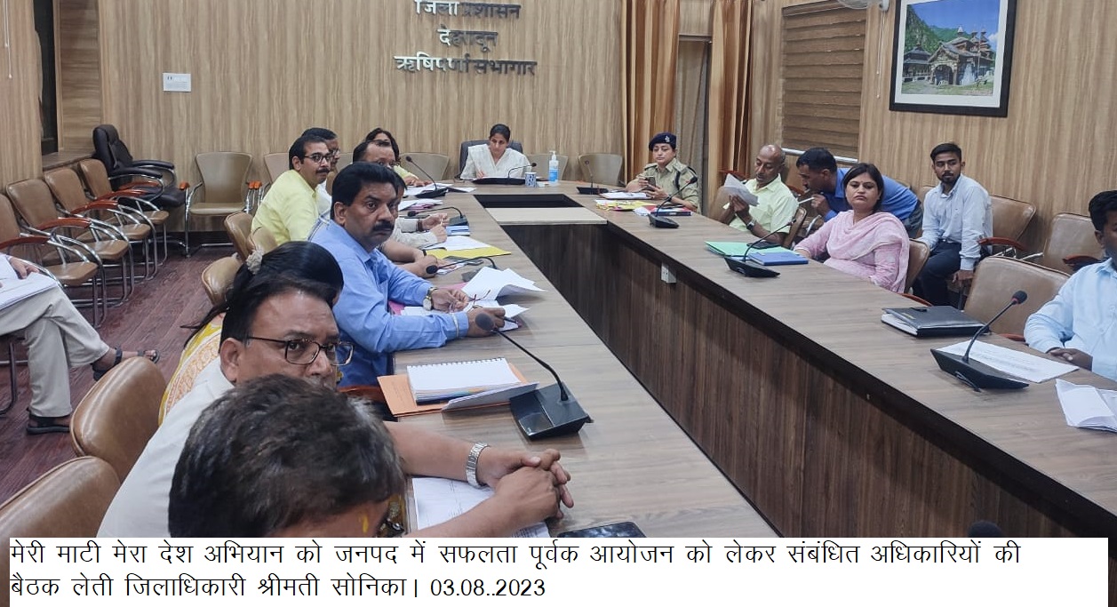 जिलाधिकारी श्रीमती सोनिका की अध्यक्षता में मेरी माटी मेरा देश अभियान को जनपद में सफलता पूर्वक आयोजन को लेकर संबंधित अधिकारियों के साथ बैठक हुई। बैठक में उन्होने 9 अगस्त से 20 अगस्त 2023 ग्राम पंचायत स्तर से लेकर महा नगर निगम तक के आयोजित होने वाले प्रत्येक कार्यक्रम को सफलता पूर्वक आयोजित करने हेतु संबंधित अधिकारियों को आवश्यक दिशा निर्देश दिया। कहा कि आयोजित होने वाले कार्यक्रमों में किसी प्रकार की दुविधा न हो इसके लिए संबंधित अधिकारी आपस में बेहतर समन्यवय बना कर कार्य करेंगे, तथा भारत सरकार एवं शासन द्वारा दिए गए दिशा निर्देशों का अक्षरश अनुपालन करेंगे। कहा कि आयोजित प्रत्येक कार्यक्रमों में शिलाफलकम की स्थापना, पंचप्रण शपथ एवं सैल्फी, वसुधा वन्दन, वीरो का वन्दन, तथा झण्डा रोहण एवं राष्ट्रगान का आयोजन किया जायेगा। 13 से 15 अगस्त 2023 को हर घर तिरंगा कार्यक्रम के तहत प्रत्येक नागरिक अपने घरों में राष्ट्रीय ध्वज लगाएंगे। जिस हेतु उन्होंने जनपद के समस्त नागरिकों से अपने-अपने घरो में राष्ट्रीय ध्वज लगाने की अपील की। कहा कि 27 अगस्त से 30 अगस्त 2023 तक प्रत्येक ग्राम पंचायत से विकास खण्ड तथा विकास खण्ड से दिल्ली कर्तव्य़ पथ तक मिट्टी यात्रा निकाली जायेगी। जिसमें राज्यों से लायी गई मिट्टी से विशेष वाटिका जिसे अमृत वाटिका कहा जायेगा। मुख्य विकास अधिकारी ने प्रेन्जेंटेशन के माध्यम से मेरी माटी मेरा देेश अभियान, कार्यक्रम आयोजन की विस्तृत जानकरी दी।