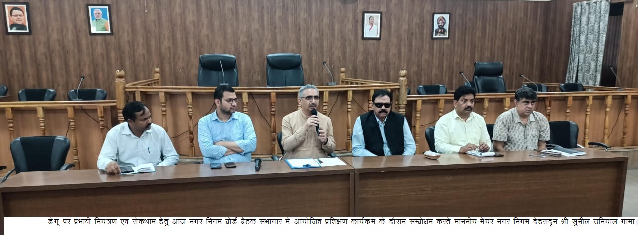 डेंगू पर प्रभावी नियंत्रण एवं रोकथाम हेतु आज नगर निगम बोर्ड बैठक सभागार में माननीय मेयर नगर निगम सुनील उनियाल गामा की अध्यक्षता में जनपद की विभिन्न हासिंग सोसायटी के सदस्यों एवं पार्षदों के साथ बैठक आयोजित की गई। बैंठक में डेंगू पर नियंत्रण एवं रोकथाम हेतु सुझाव के साथ ही विभिन्न बिन्दुओं पर चर्चा हुई तथा विशेषज्ञ चिकित्सकों द्वारा डेंगू से निपटने एवं प्रभावी नियंत्रण विस्तारपूर्वक जानकारी दी गई। इसके उपरान्त मुख्य नगर आयुक्त नगर निगम मनुज गोयल ने डेंगू नियंत्रण एवं रोकथाम हेतु वार्डवार नामित किये गए अधिकारियों को प्रशिक्षण दिया।