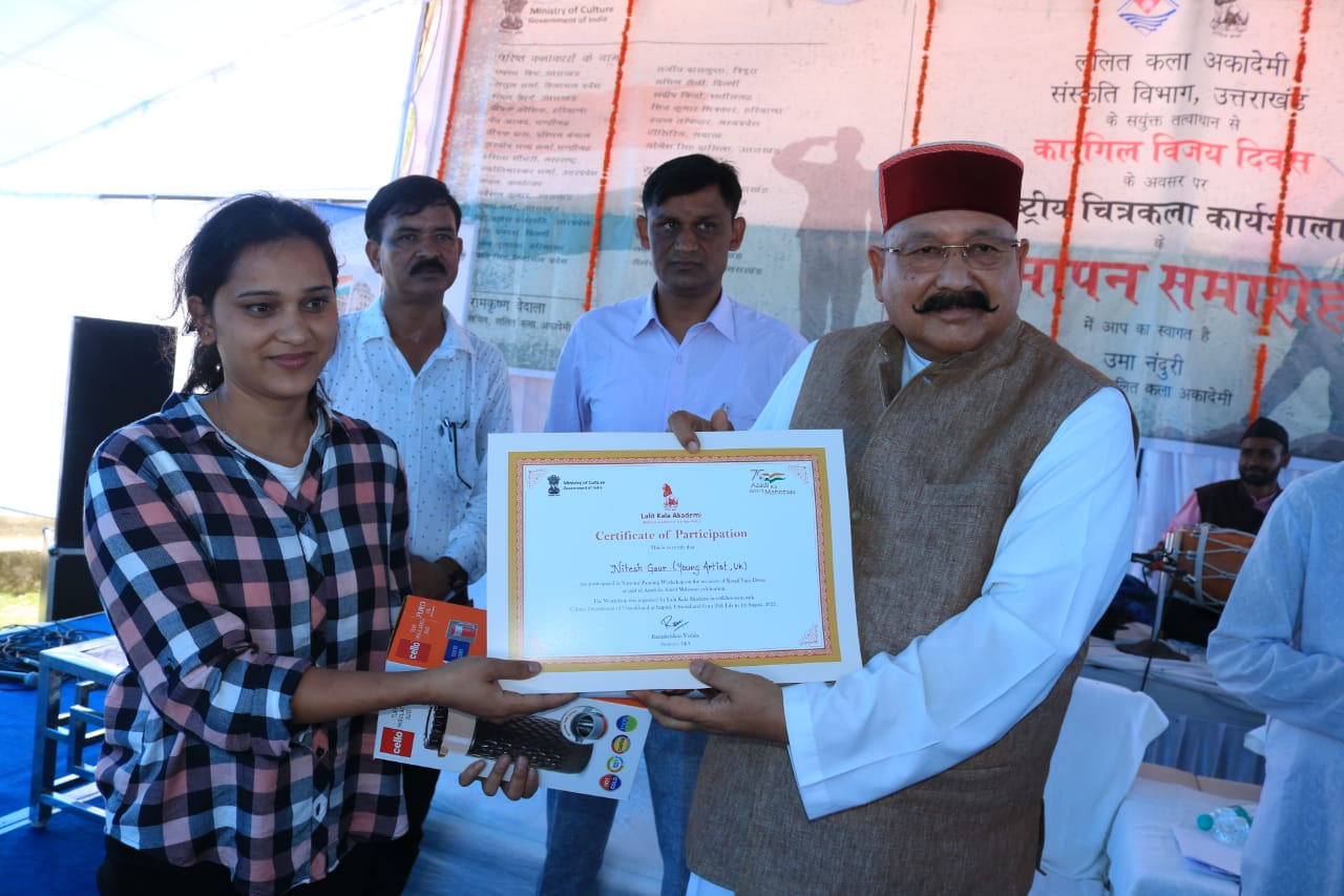 ललित कला अकादमी भारत सरकार एवं संस्कृति विभाग उत्तराखंड के संयुक्त तत्वाधान में 26 जुलाई (कारगिल दिवस) से चल रही राष्ट्रीय चित्रकला कार्यशाला का हुआ समापन।