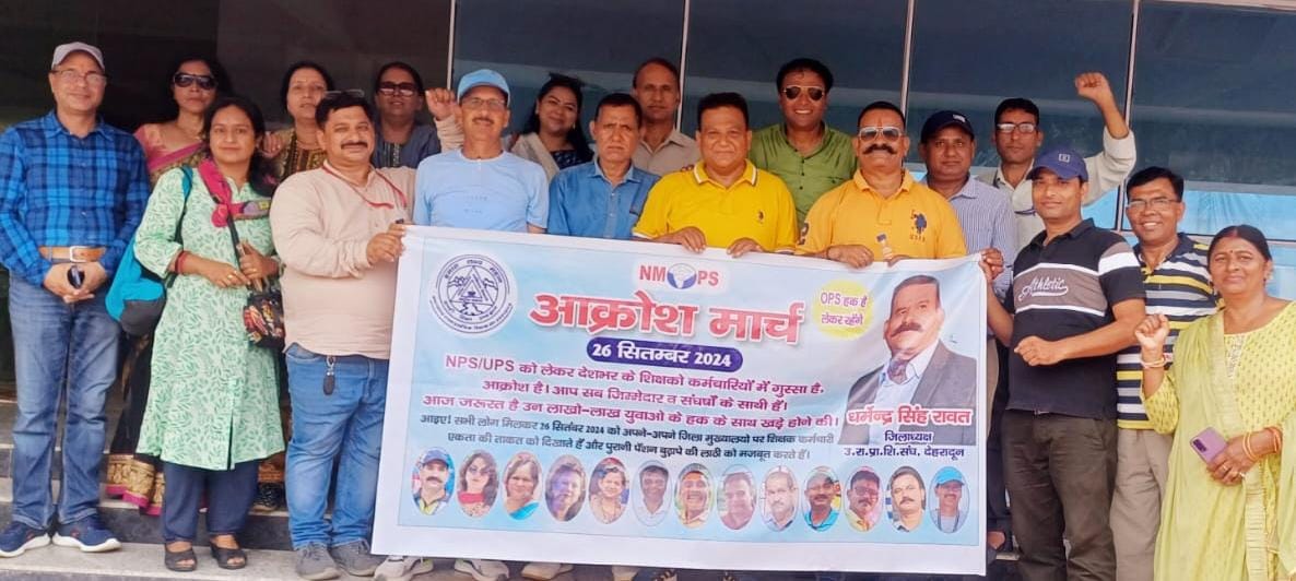 NMOPS की राष्ट्रीय कार्यकारिणी के अहवाहन पर उत्तराखंड राज्य प्राथमिक शिक्षक संघ, देहरादून के जिलाध्यक्ष धर्मेन्द्र सिंह रावत के नेतृत्व में जनपद के शिक्षको द्वारा जनपद में चल रही प्रारंभिक जनपद स्तरीय क्रीड़ा एवम सांस्कृतिक प्रतियोगिता के भोजन अवकाश के समय पर पुरानी पेंशन बहाली हेतु जन आक्रोश मार्च का आयोजन किया गया ।