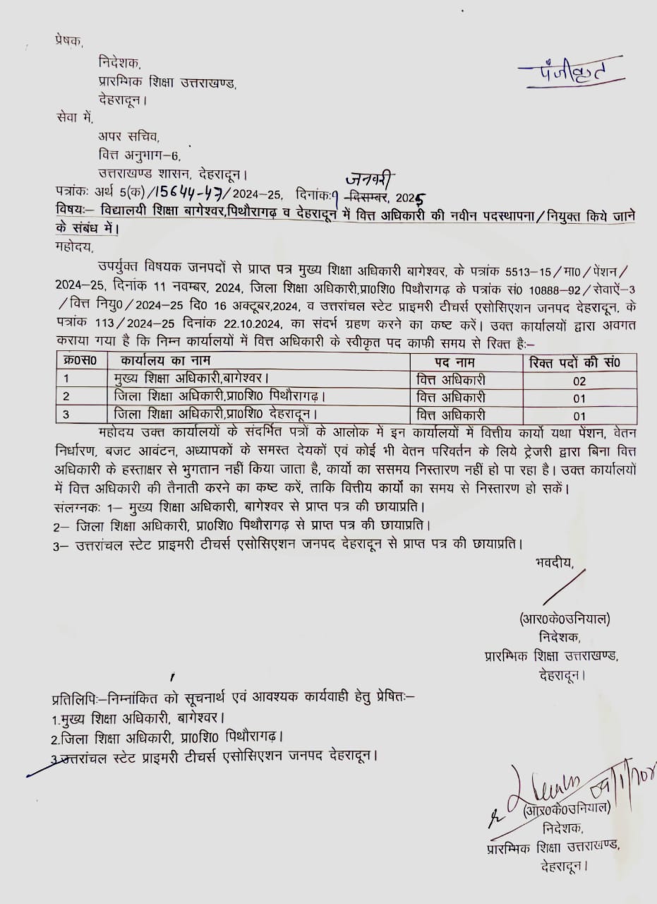 उत्तराखंड राज्य प्राथमिक शिक्षक संघ जनपद देहरादून की जिलाध्यक्ष धर्मेन्द्र सिंह रावत की अगुवाई में जनपद देहरादून में स्थायी जिला वित्त अधिकारी (FO) की नियुक्ति के सम्बन्ध में लगातार निदेशक (प्रारम्भिक शिक्षा) उत्तराखंड से मांग की जा रही थी। क्योंकि विगत कई माह से जनपद देहरादून में कोई स्थायी जिला वित्त अधिकारी (FO) के न होने के कारण अध्यापकों के विभिन्न वित्तिय कार्य यथा सेवानिवृत्त अध्यापकों के देयक, चिकित्साप्रतिपूर्ति देयक, विभिन्न एरियर से सम्बन्धित देयक, चयन, प्रोन्नत वेतनमान एरियर,सामान्य भविष्य निधि के अनेक प्रकारण,वेतन निर्धारण जैसे अनेक वित्तीय कार्य रूके हुये हैं।