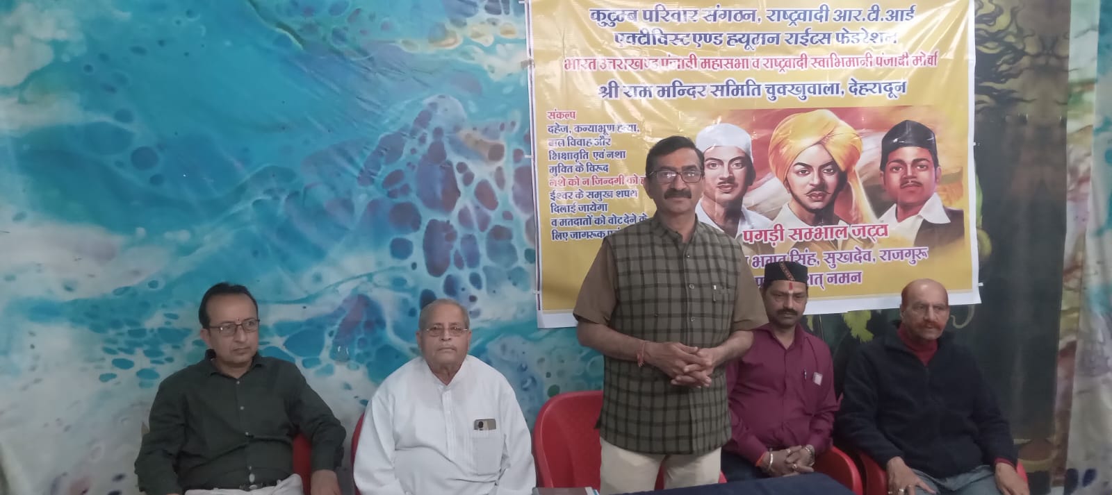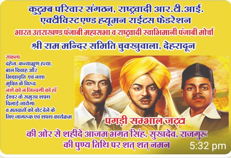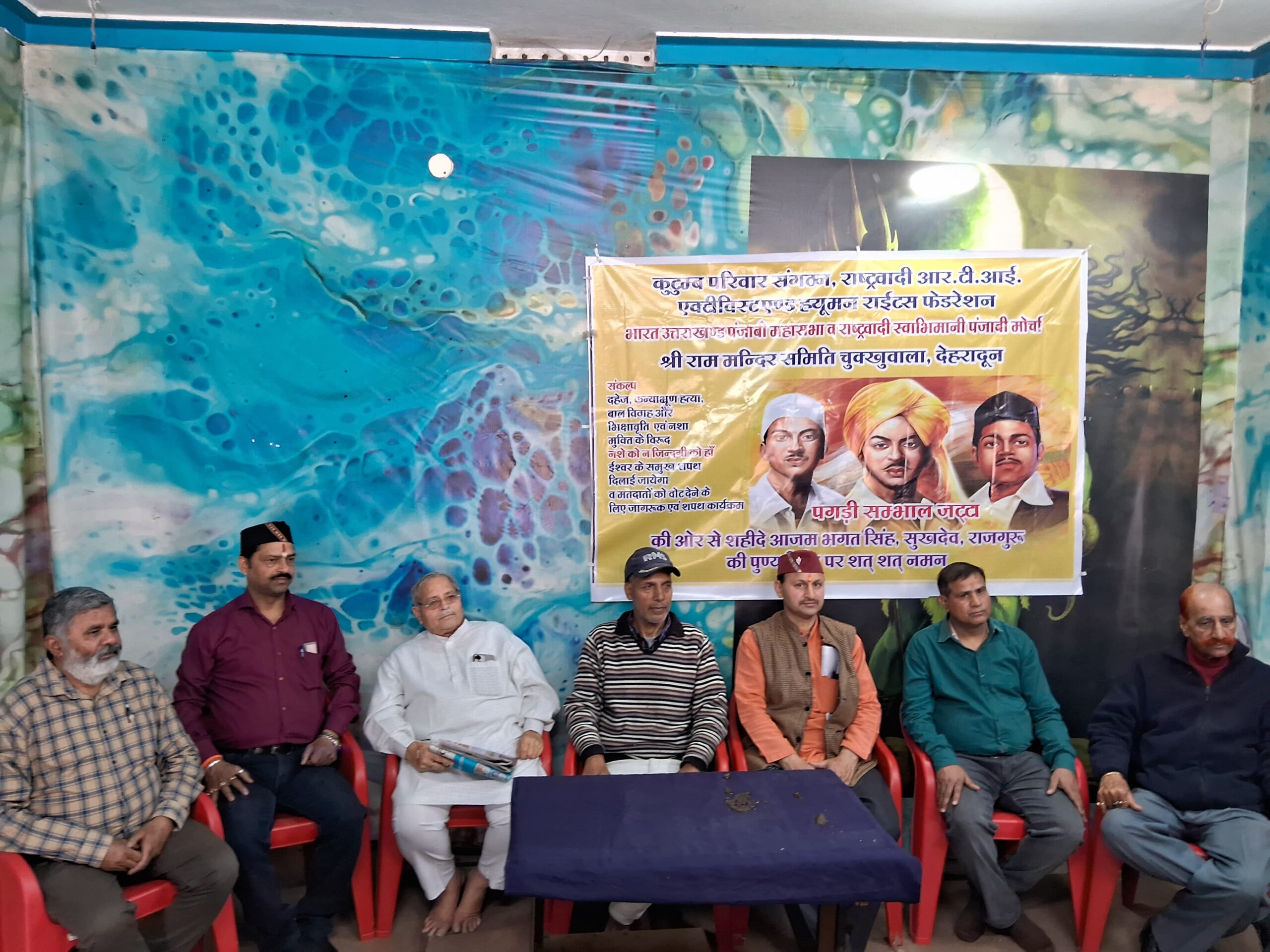 आज चखुवाला के श्री राम मंदिर में कुटुंब परिवार संगठन, राष्ट्रवादी आर.टी.आई एक्टिविस्ट एंड ह्यूमन राइट्स फेडरेसन भारत,उत्तराखंड पंजाबी महासभा, राष्ट्रवादी स्वभिमानी पंजाबी मोर्चा व श्री राम मंदिर समिति चखुवाला ने सयुंक्त रूप से शहीद ऐ आजम भगत सिंह, सुखदेव व राजगुरु की 93वी पुण्यतिथि मनाई।