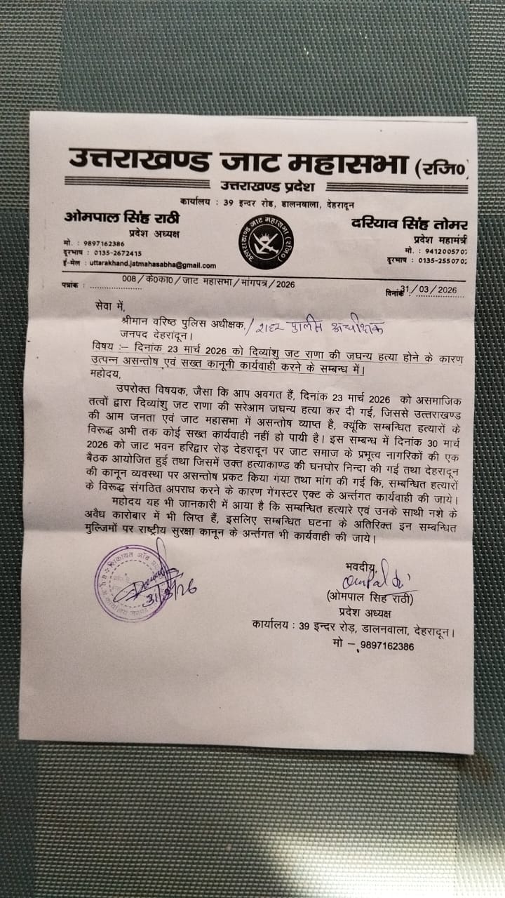 उपरोक्त विषयक, जैसा कि आप अवगत हैं, दिनांक 23 मार्च 2026 को असमाजिक तत्वों द्वारा दिव्यांशु जट राणा की सरेआम जघन्य हत्या कर दी गई, जिससे उत्तराखण्ड की आम जनता एवं जाट महासभा में असन्तोष व्याप्त है, क्यूंकि सम्बन्धित हत्यारों के विरूद्ध अभी तक कोई सख्त कार्यवाही नहीं हो पायी है। इस सम्बन्ध में दिनांक 30 मार्च 2026 को जाट भवन हरिद्वार रोड़ देहरादून पर जाट समाज के प्रभूत्व नागरिकों की एक बैठक आयोजित हुई तथा जिसमें उक्त हत्याकाण्ड की घनघोर निन्दा की गई तथा देहरादून की कानून व्यवस्था पर असन्तोष प्रकट किया गया तथा मांग की गई कि, सम्बन्धित हत्यारों के विरूद्ध संगठित अपराध करने के कारण गैंगस्टर एक्ट के अन्र्तगत कार्यवाही की जाये।