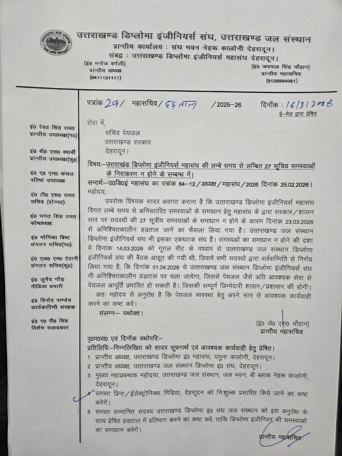 जिसमें सर्व सम्मति से निर्णय लिया गया कि आगामी 1अप्रैल 2026से उत्तराखंड जल संस्थान डिप्लोमा इंजीनियर्स संघ भी हड़ताल पर चला जाएगा, जिससे पेयजल आपूर्ति जैसी अति आवश्यक सेवा से पेयजल आपूर्ति प्रभावित हो सकती हैं जिसकी संपूर्ण जिम्मेदारी शासन/प्रशासन की होंगी ये जानकारी प्रेस विज्ञप्ति द्वारा जारी की गई।
